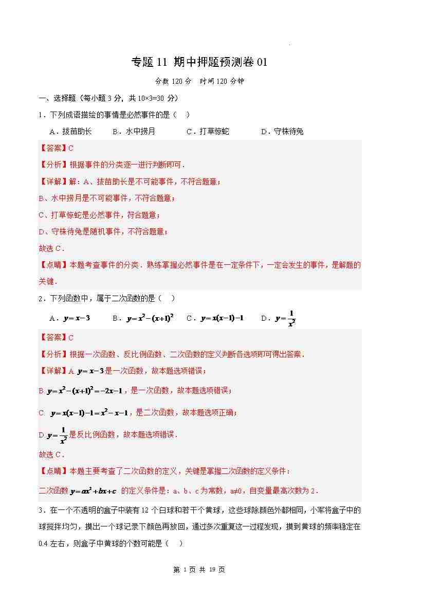 专题11 期中押题预测卷01(解析版)(人教版)