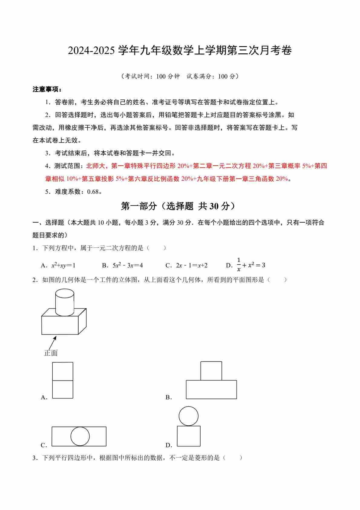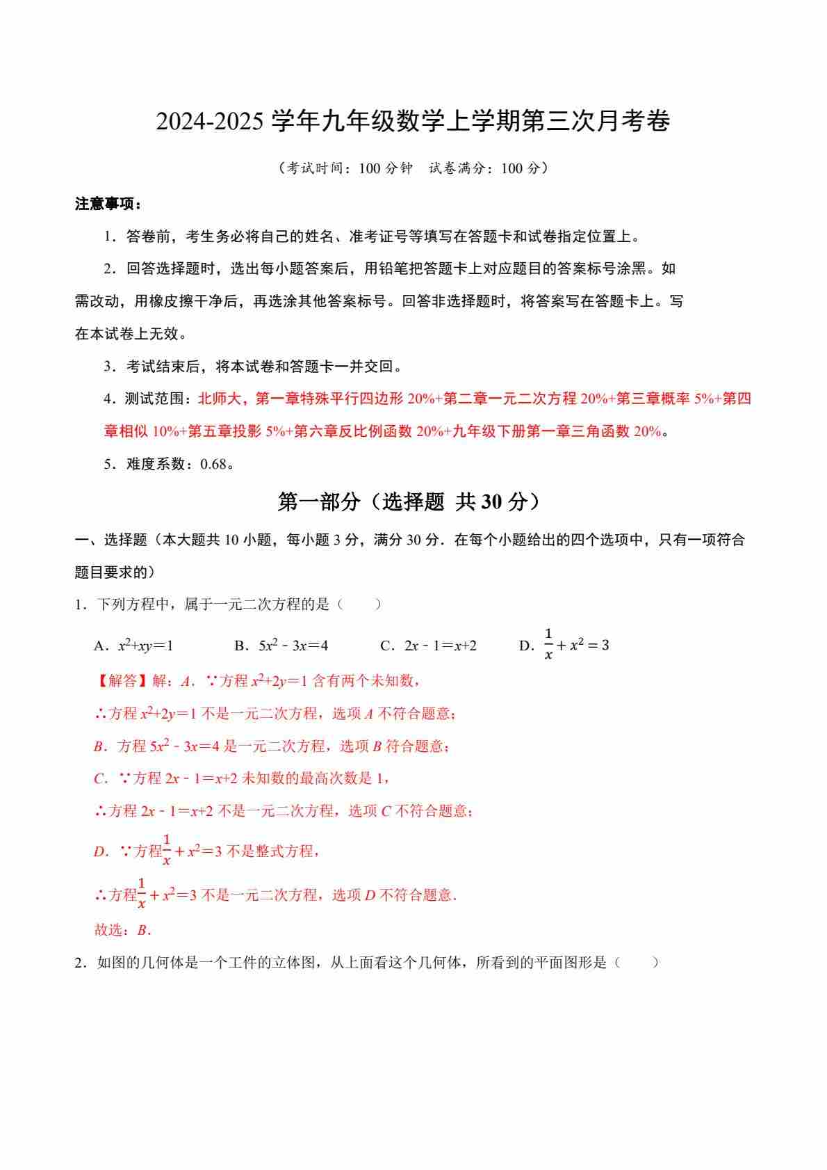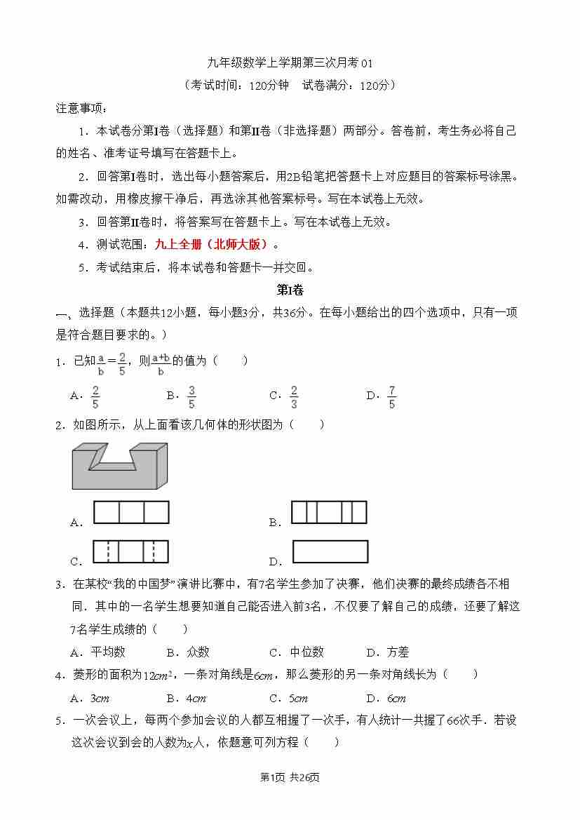 九上数学:【北师】第三次月考卷【范围:九上全册】