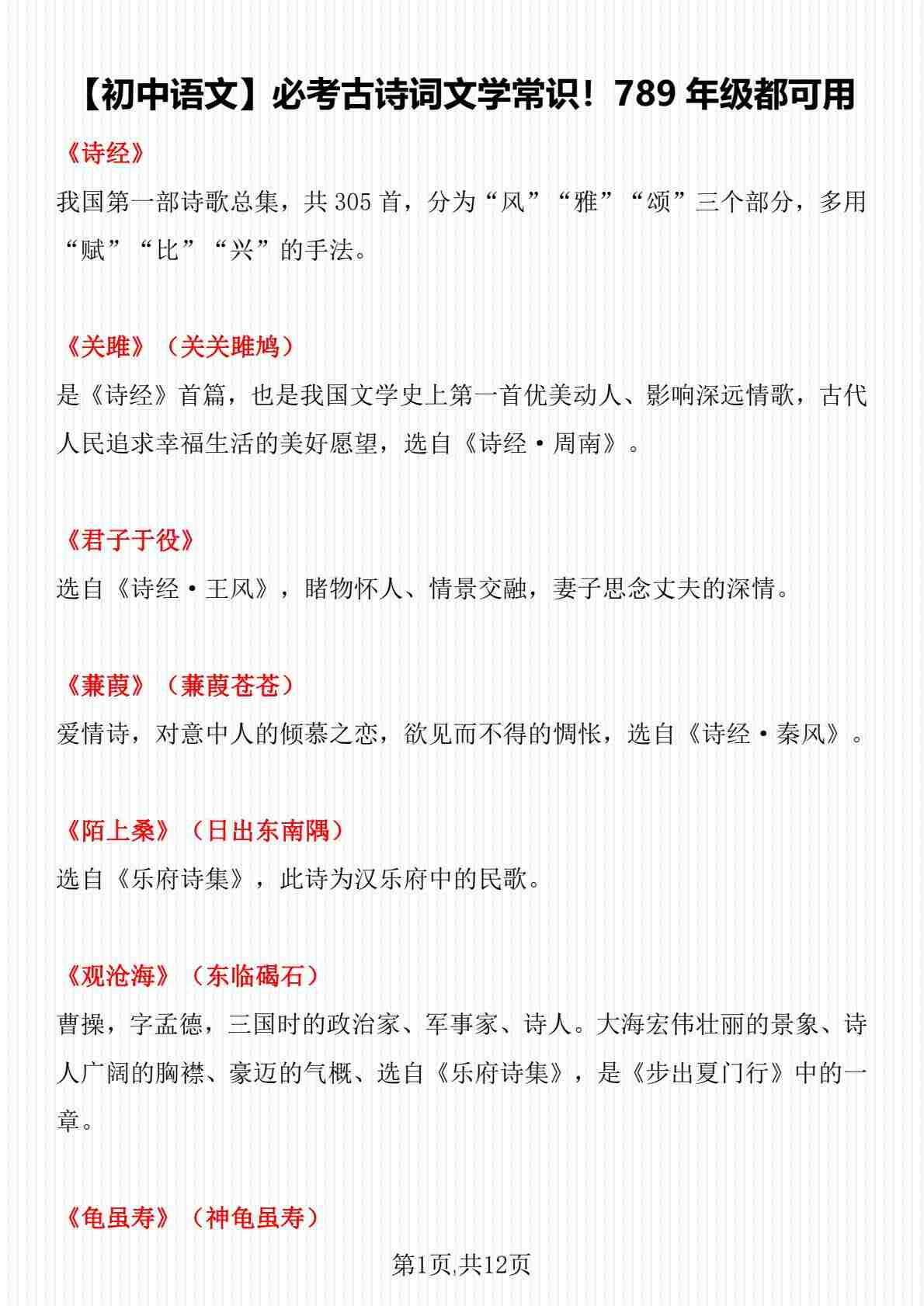 【初中语文】必考古诗词文学常识,100张试卷高频统计而成!