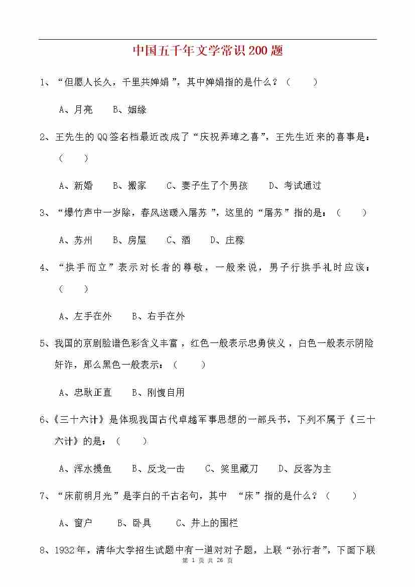 中国五千年文学常识200题