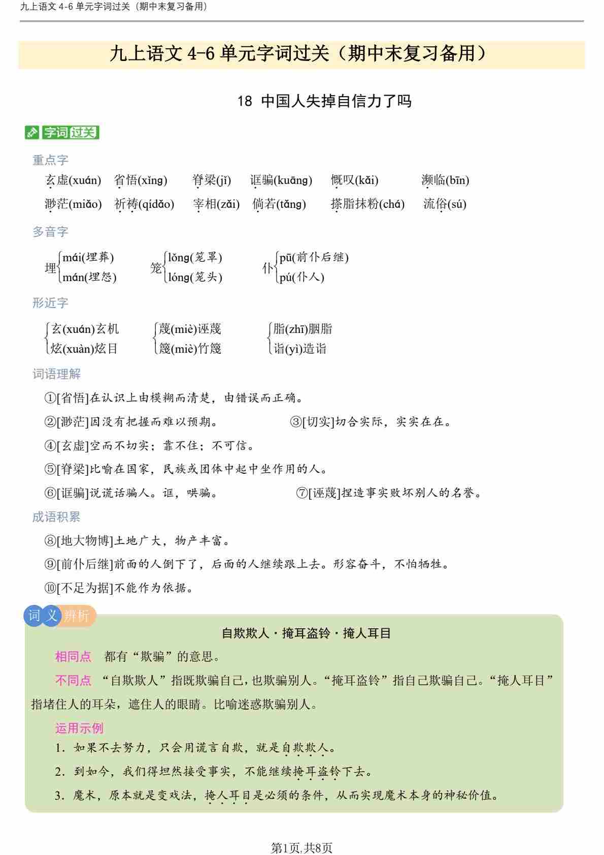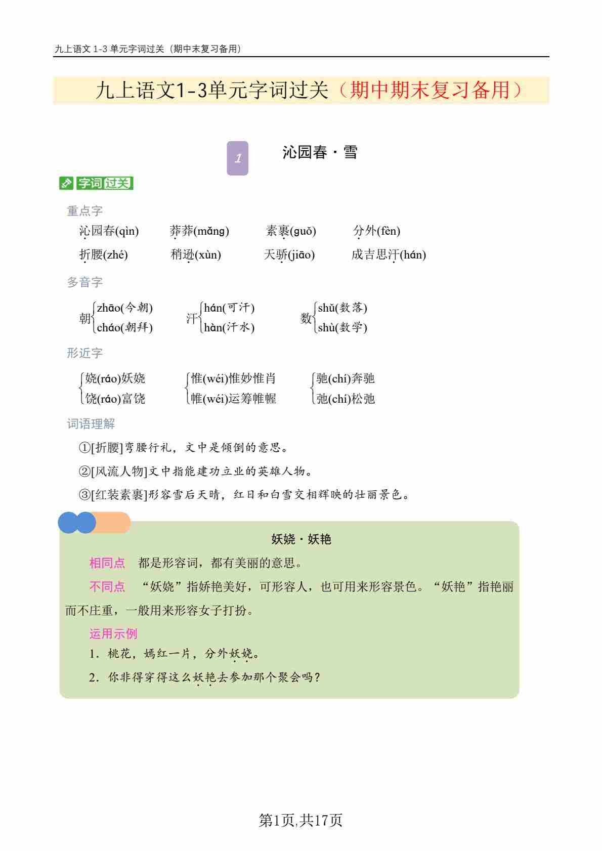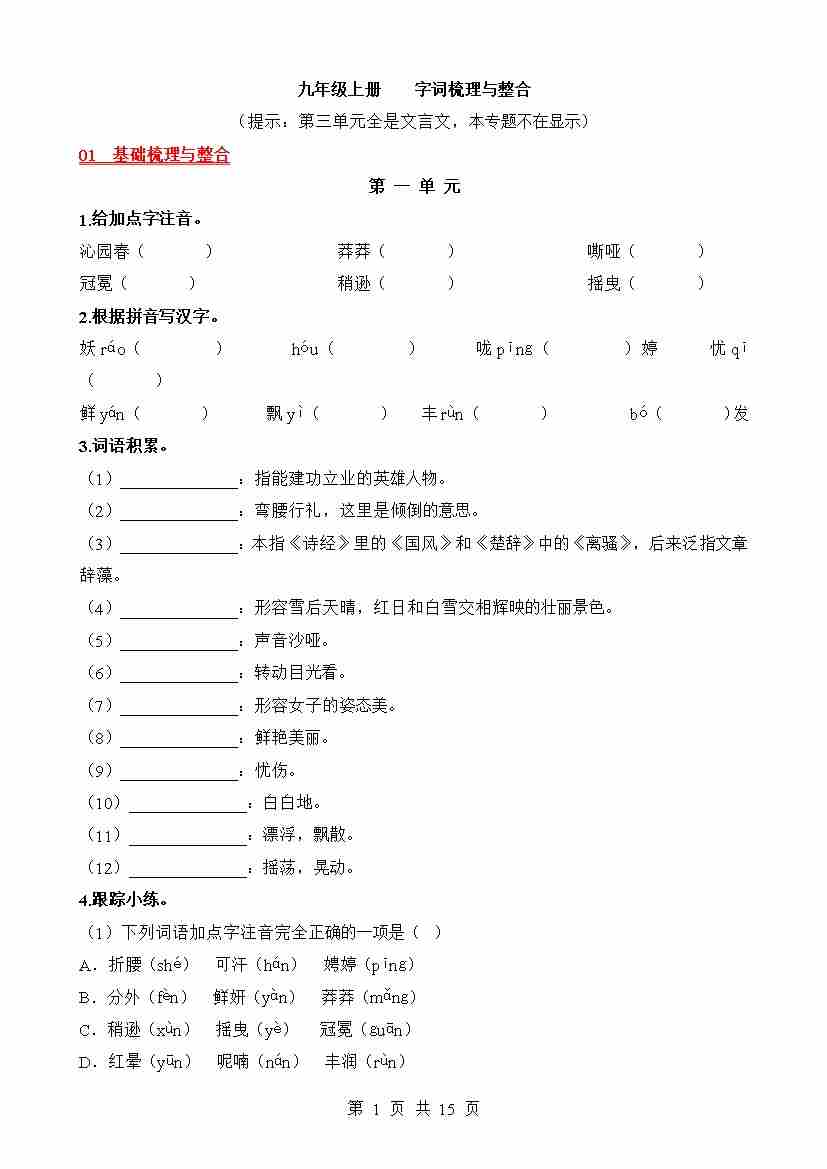 九上语文1-3单元字词过关(期中期末复习备用)