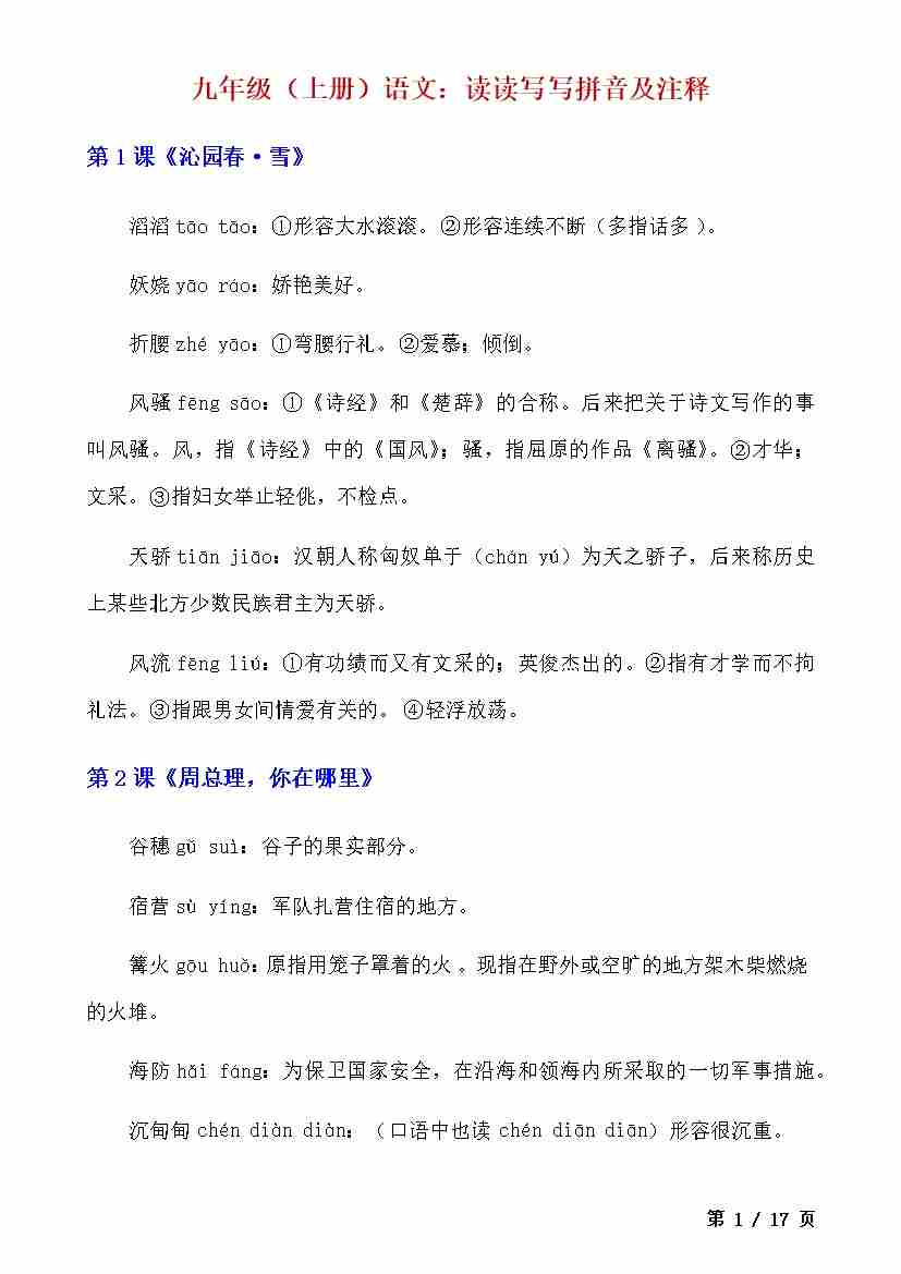 九上语文读读写写注音及解释