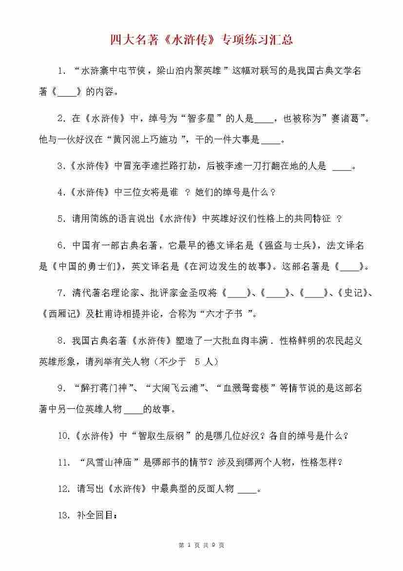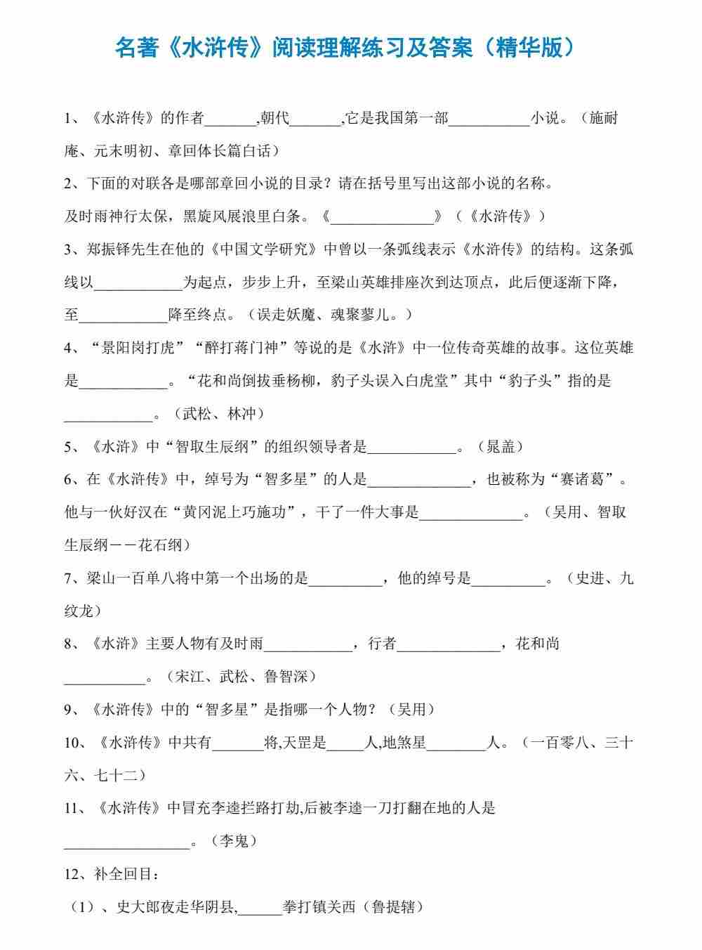 四大名著《水浒传》专项练习汇总