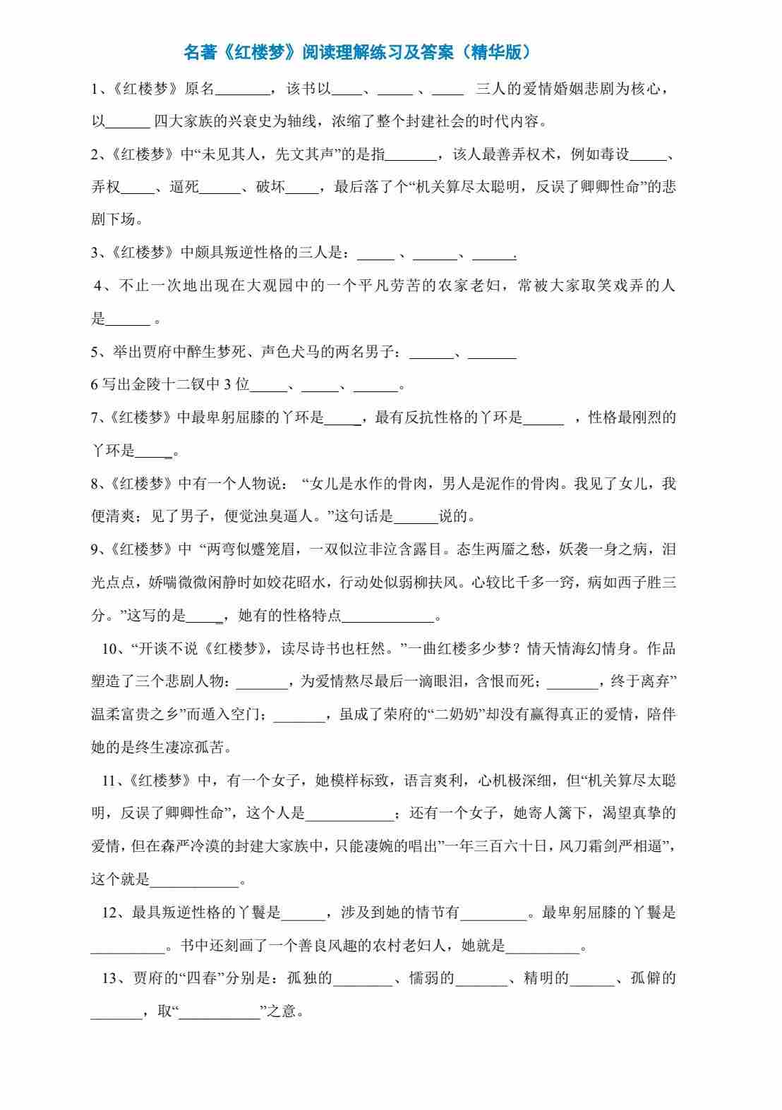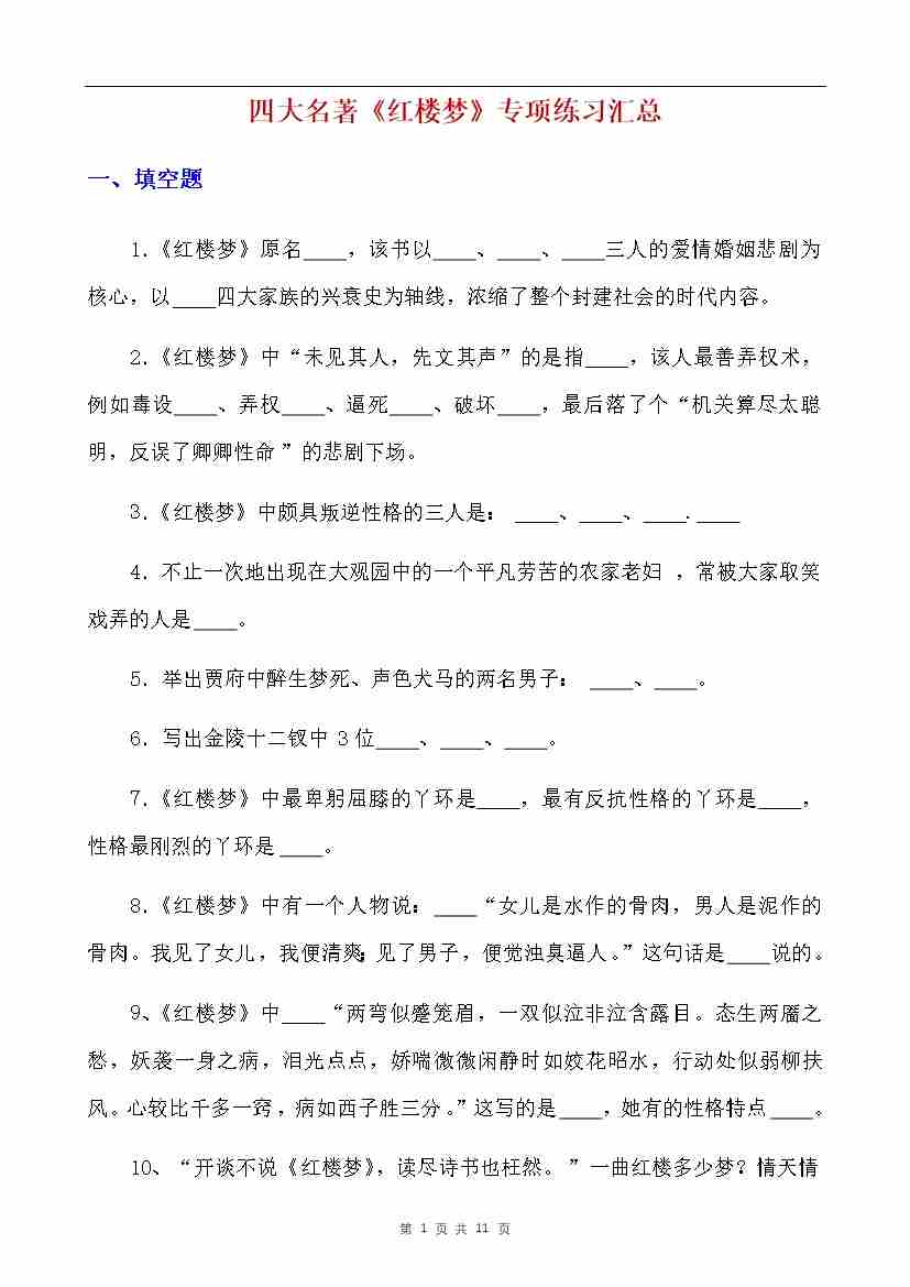 四大名著《红楼梦》专项练习汇总