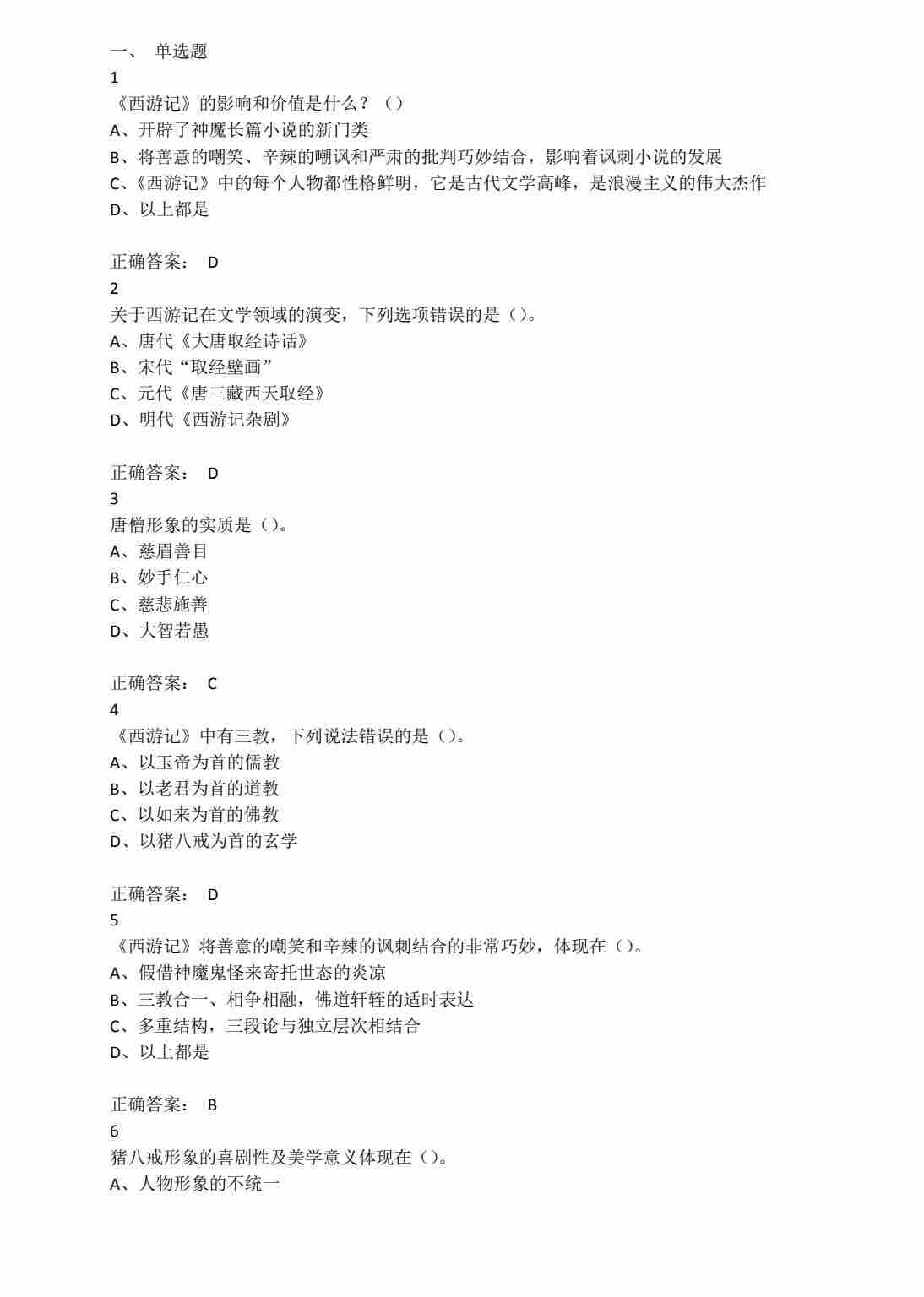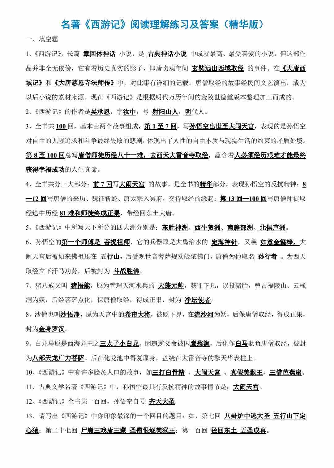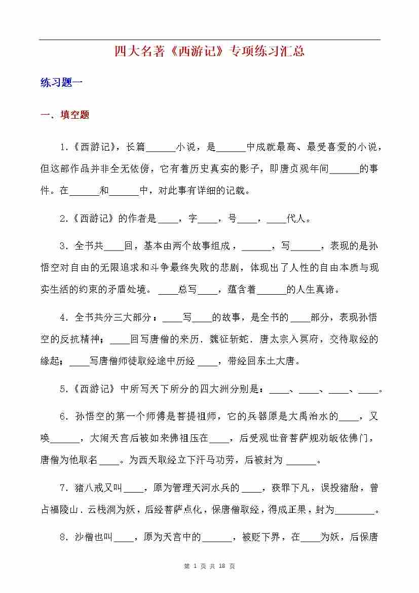 四大名著《西游记》专项练习汇总