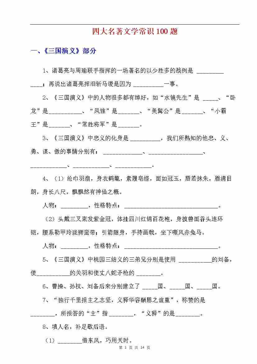 四大名著文学常识100题--