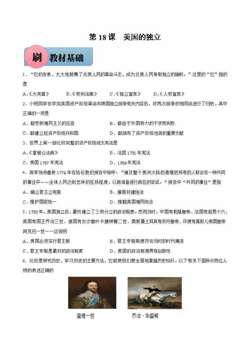 第18课 美国的独立【必刷题】