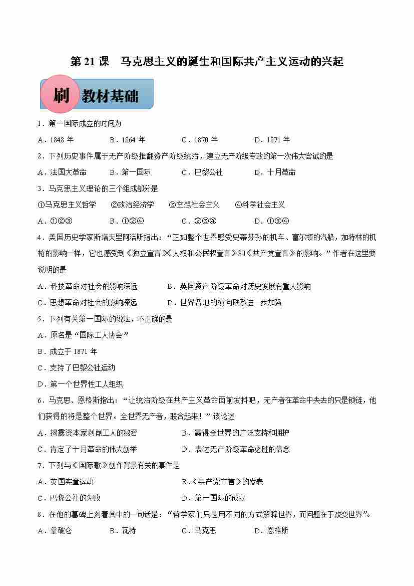 第21课 马克思主义的诞生和国际共产主义运动的兴起【必刷题】