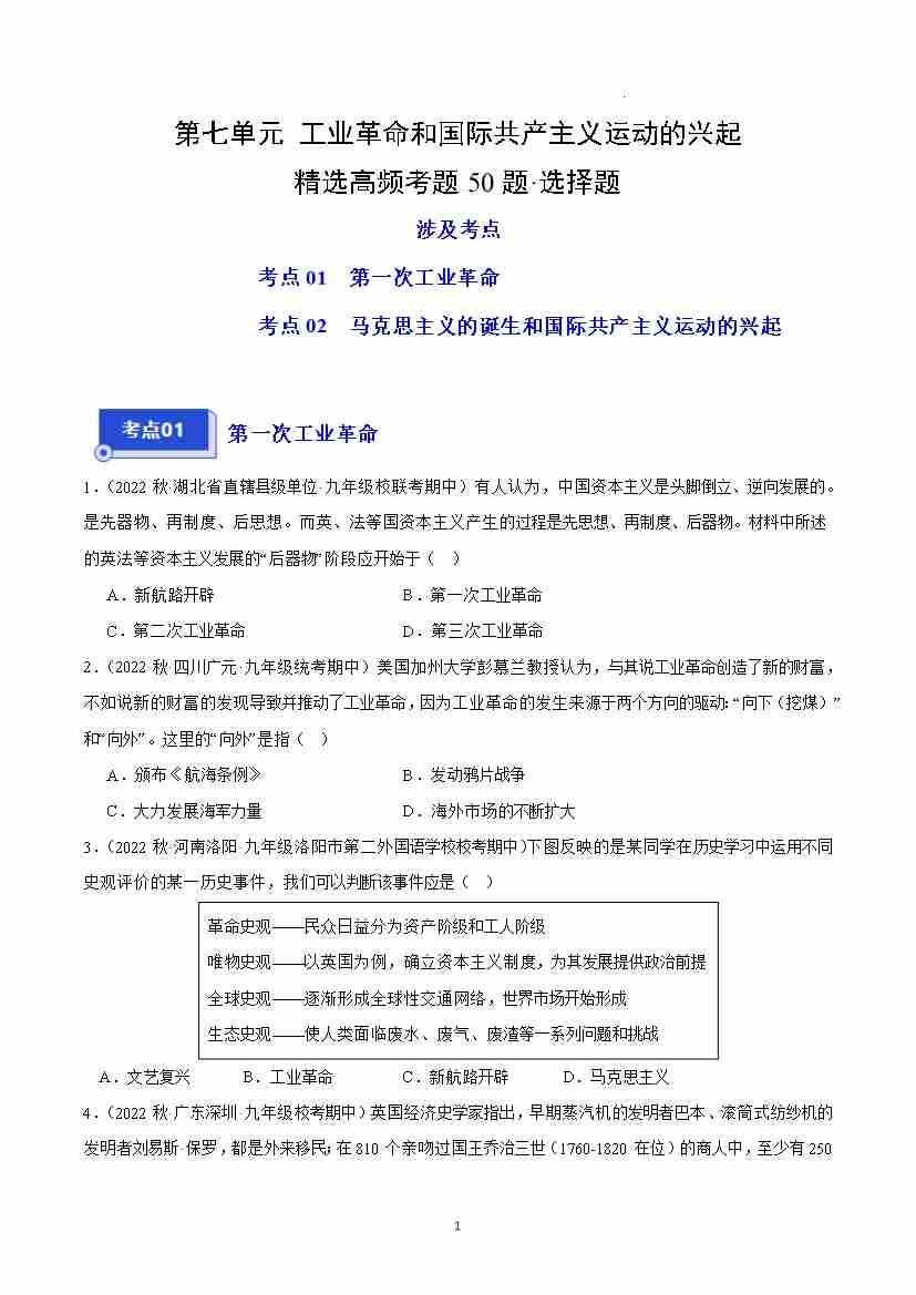 第七单元 工业革命和国际共产主义运动的兴起(高频选择题50题)(原卷版)