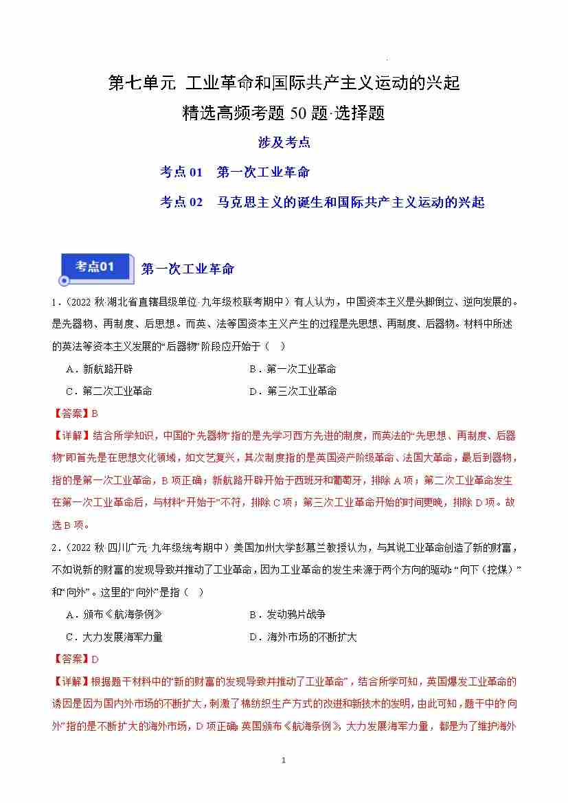 第七单元 工业革命和国际共产主义运动的兴起(高频选择题50题)(解析版)