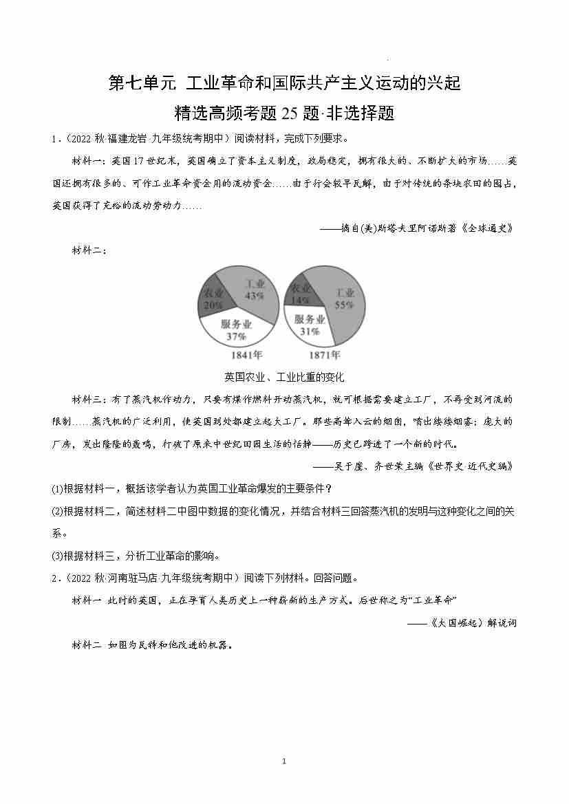 第七单元 工业革命和国际共产主义运动的兴起(高频非选择题25题)(原卷版)