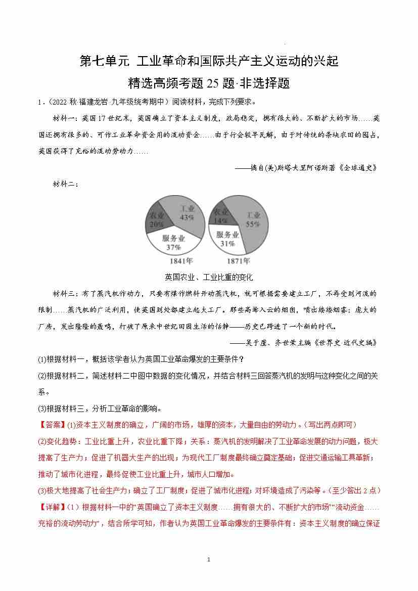 第七单元 工业革命和国际共产主义运动的兴起(高频非选择题25题)(解析版)