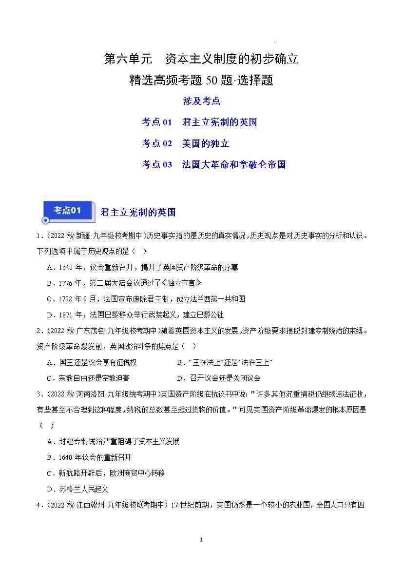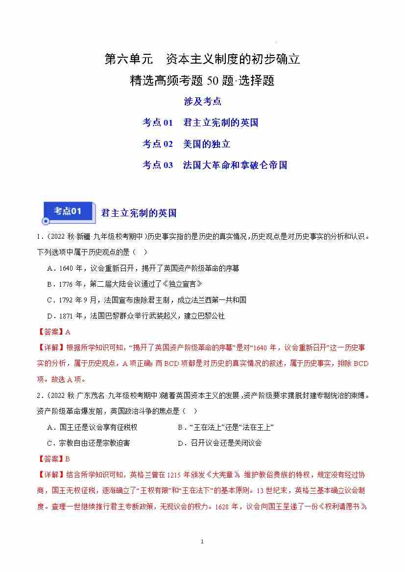 第六单元 资本主义制度的初步确立(高频选择题50题)(解析版)