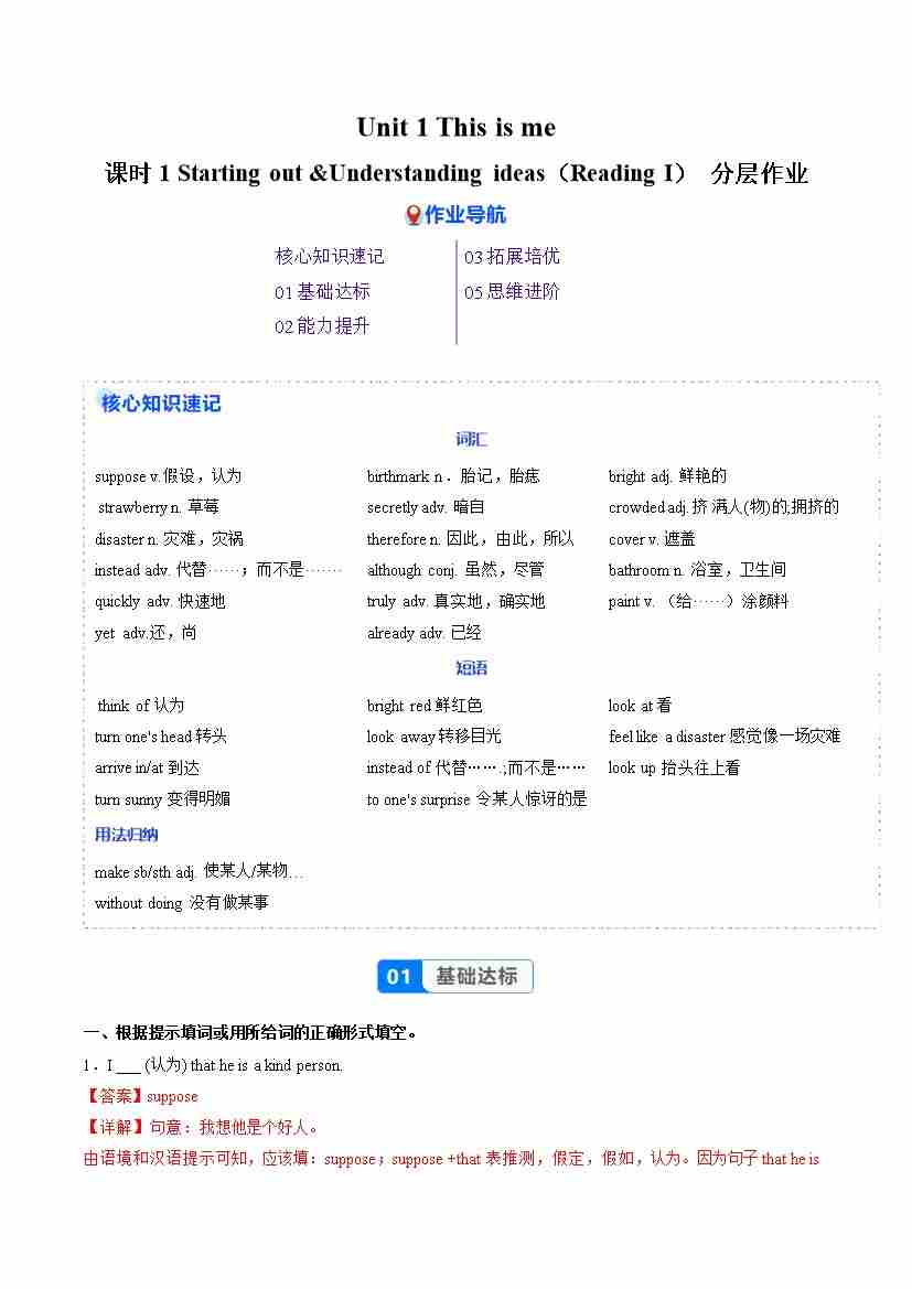 Unit 1 课时1 Starting out -- Understanding ideas(Reading词汇)(分层作业)(解析版)