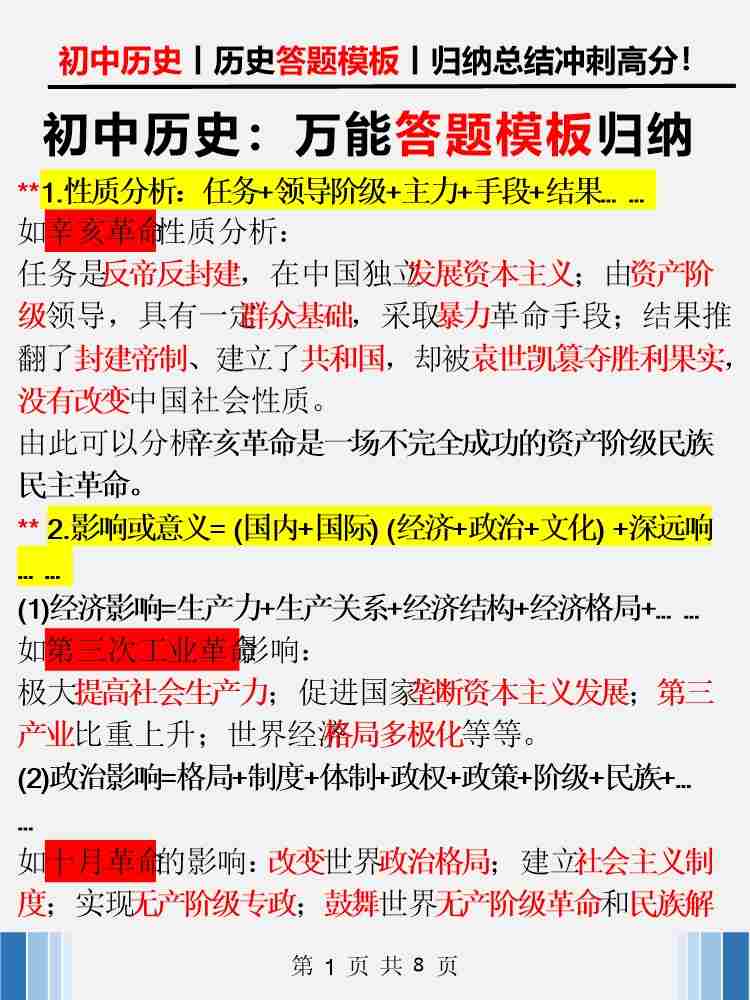 初中历史:万能答题模板归纳总结-九上历史-统编