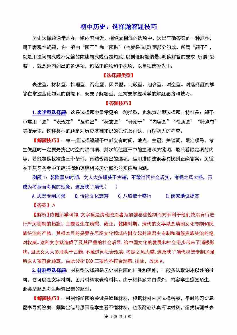 初中历史:选择题答题技巧-九上历史-统编
