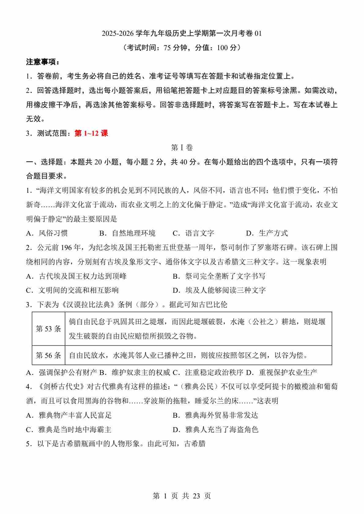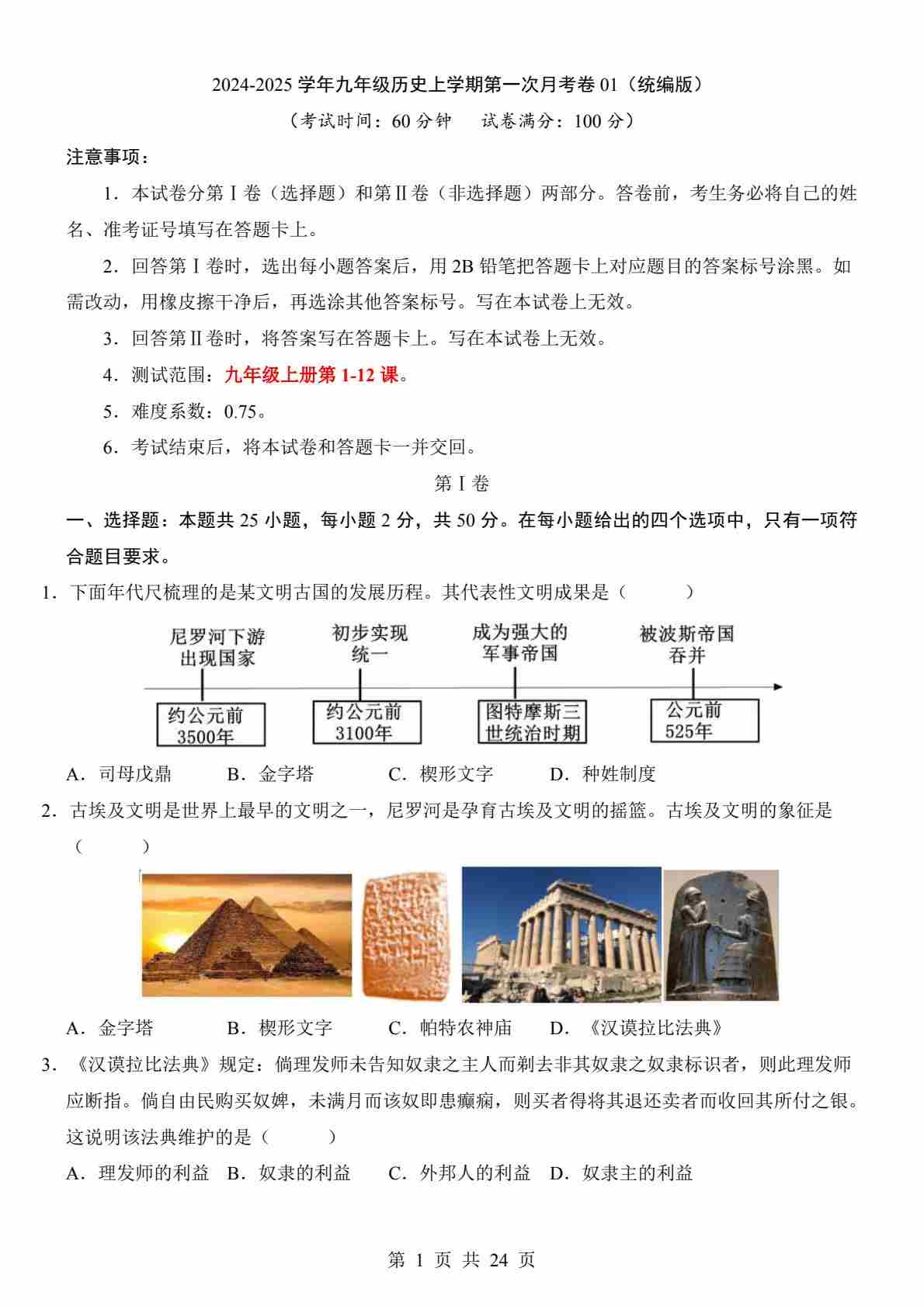 九上历史:第三次月考卷01(考试+解析)【范围:九上+九下第1-7课】