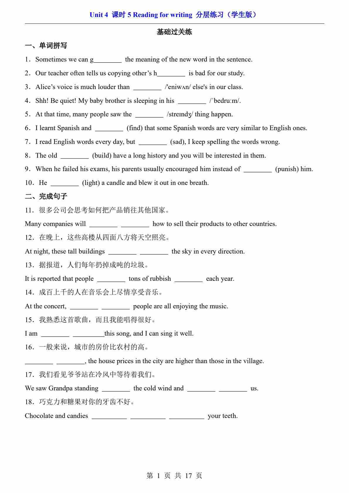 Unit 4 课时5 Reading for writing(分层练习)-外研版-八上英语