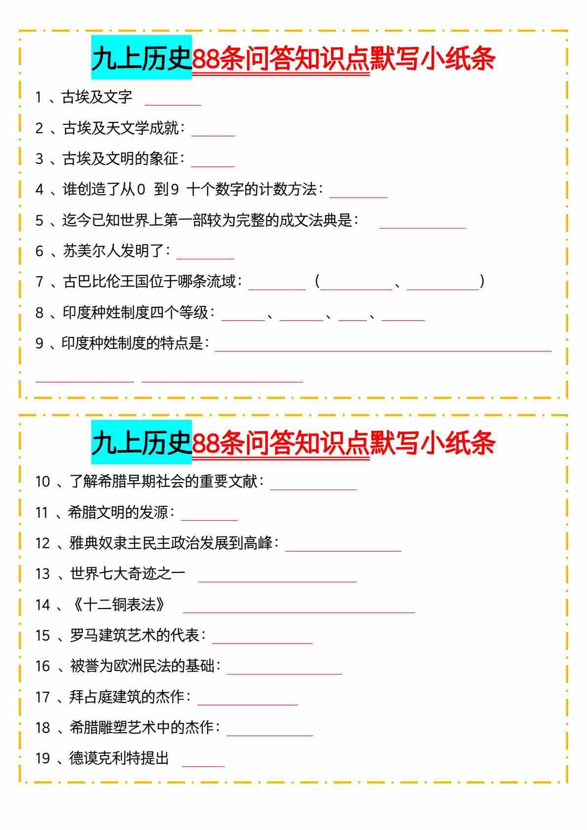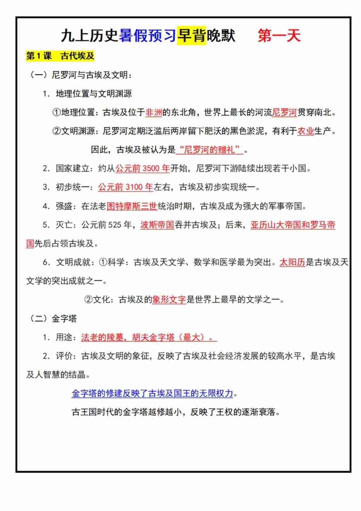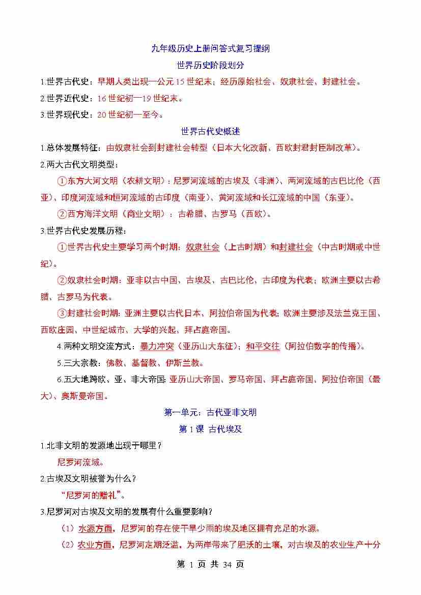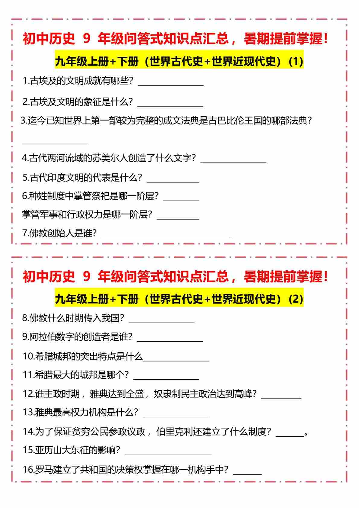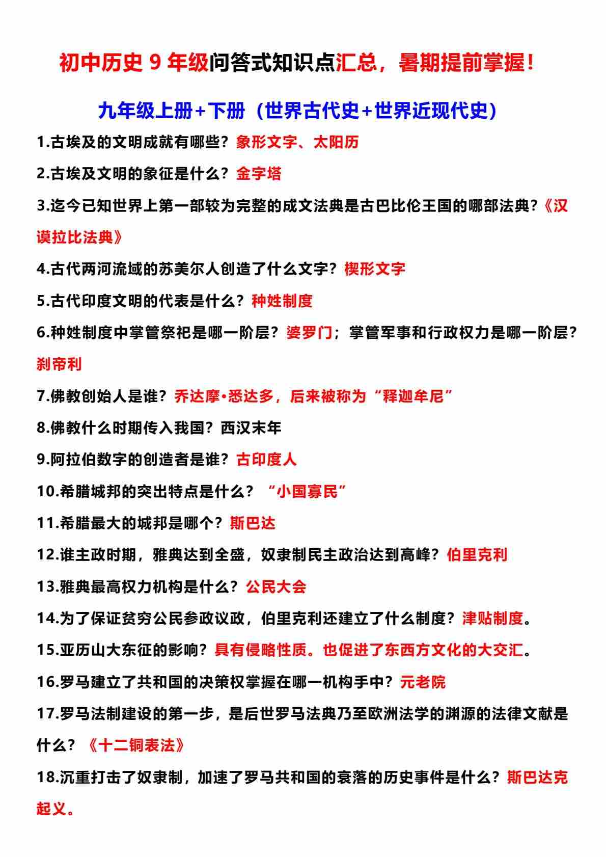 九年级(上册)历史问答式知识点汇总,暑期提前掌握!
