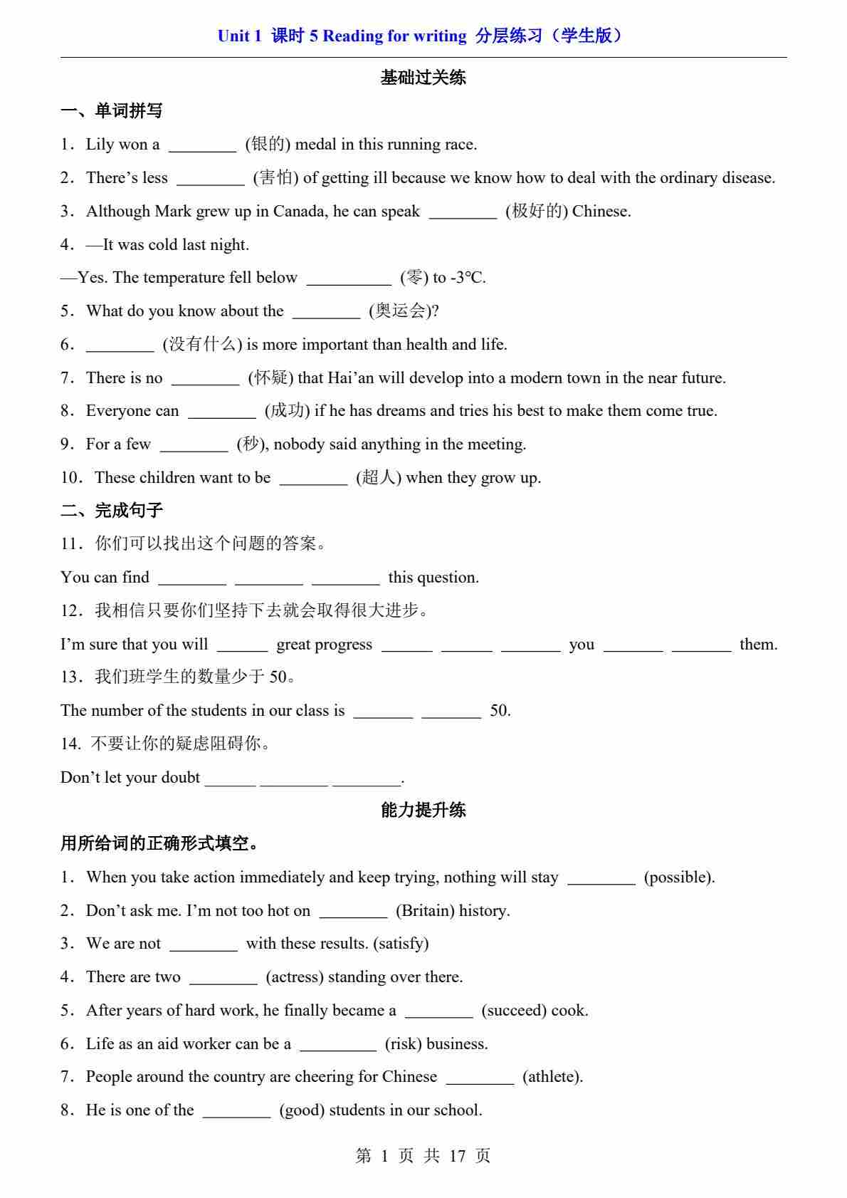 Unit 1 课时5 Reading for writing(分层练习)-外研版-八上英语
