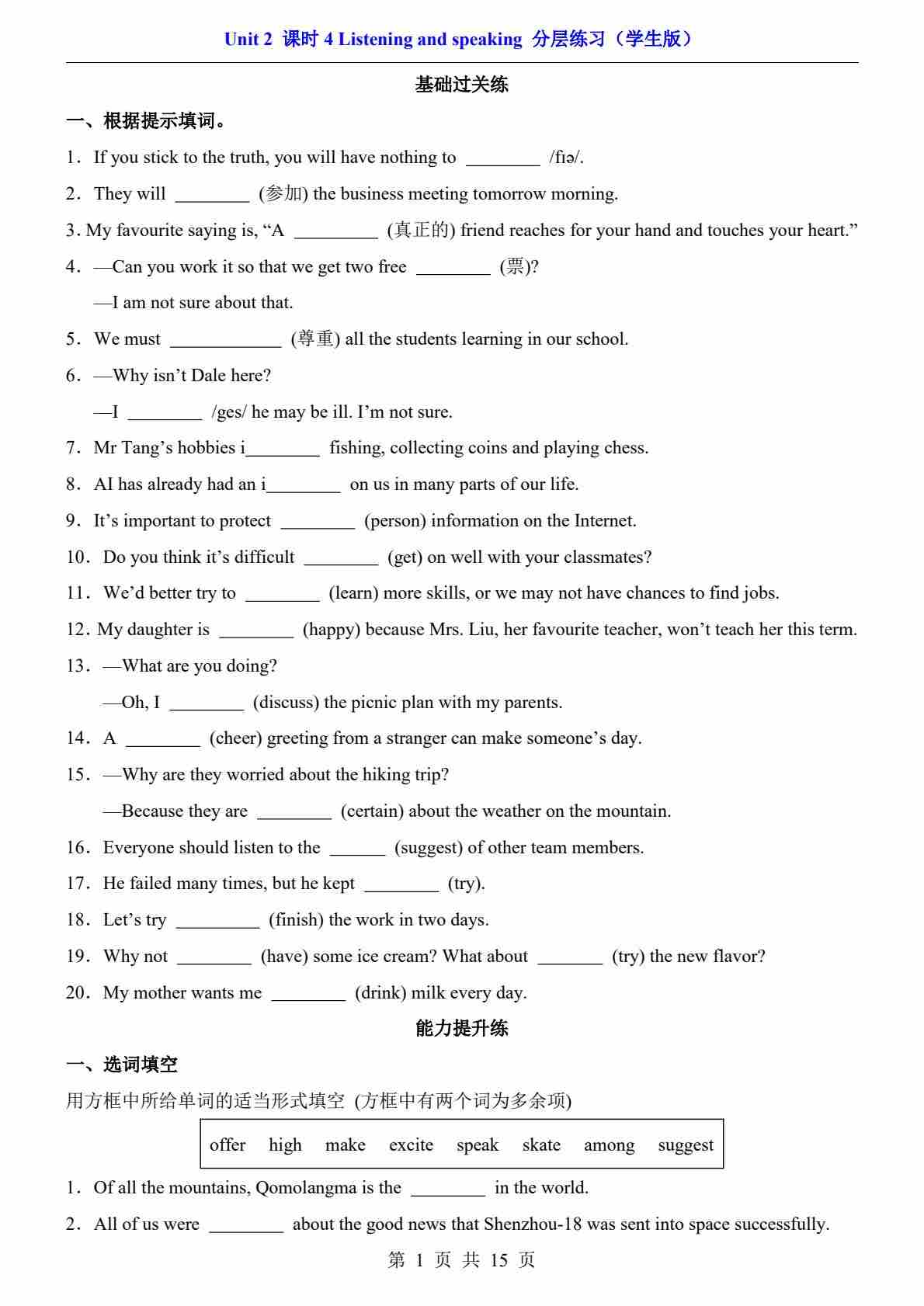 Unit 2 课时4 Listening and speaking(分层练习)-外研版-八上英语