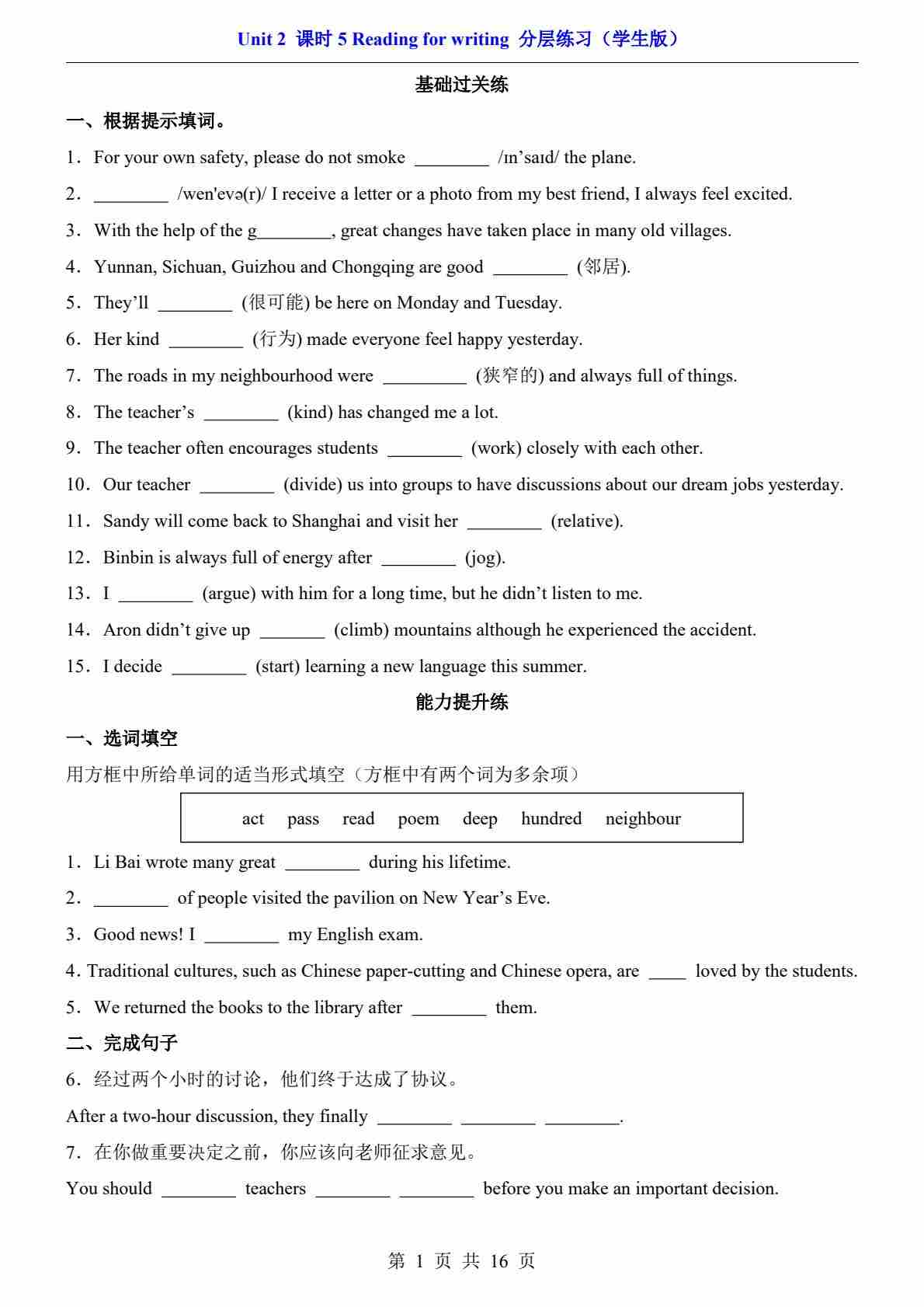 Unit 2 课时5 Reading for writing(分层练习)-外研版-八上英语