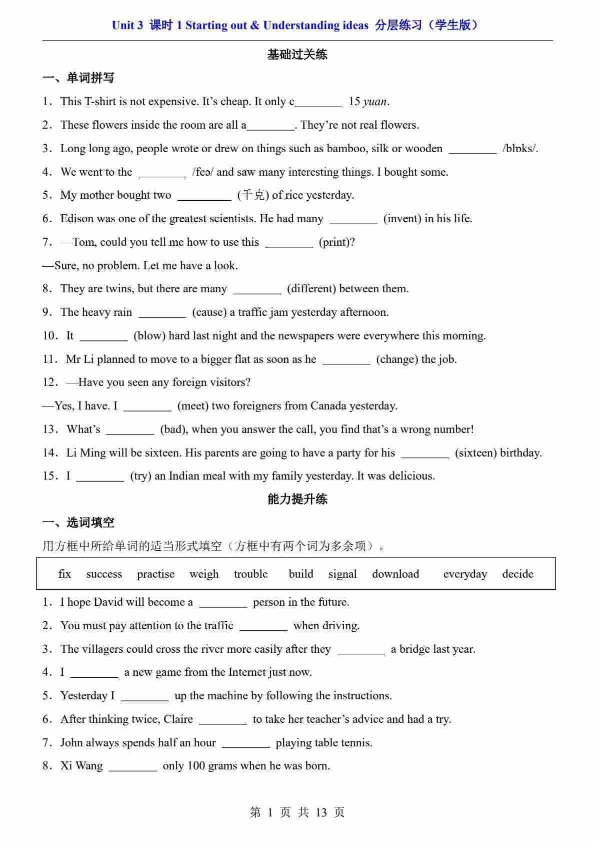 Unit 3 课时1 Starting out & Understanding ideas(分层练习)-外研版-八上英语