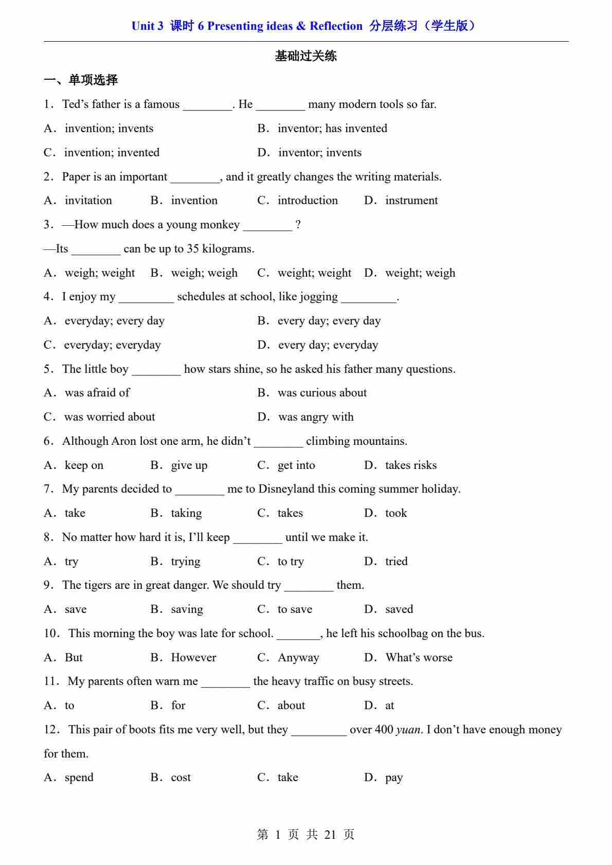 Unit 3 课时6 Presenting ideas --Reflection(分层练习)-外研版-八上英语