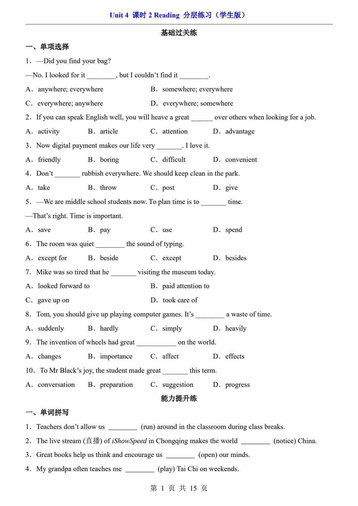 Unit 4 课时2 Reading(分层练习)-外研版-八上英语