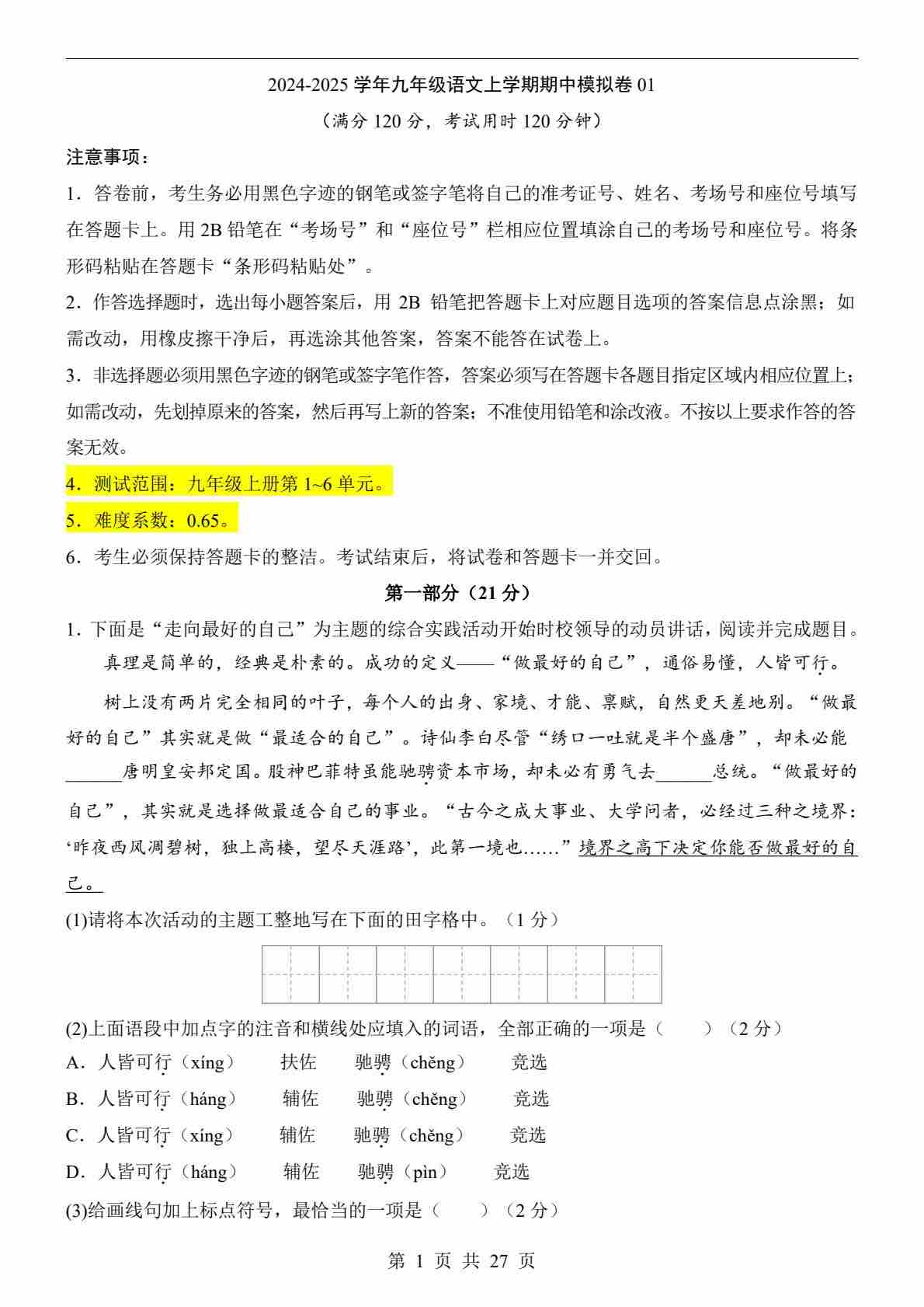 9上语文期中卷01【第1-6单元】