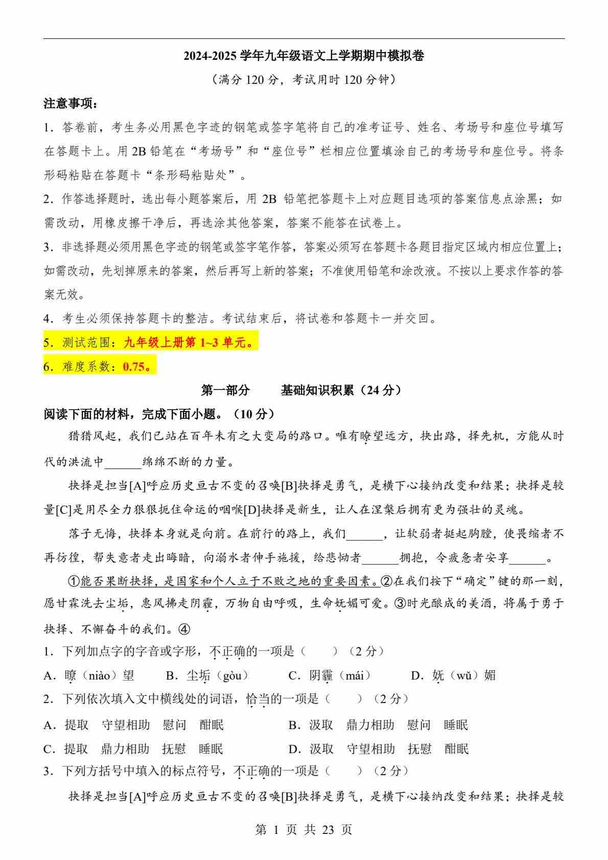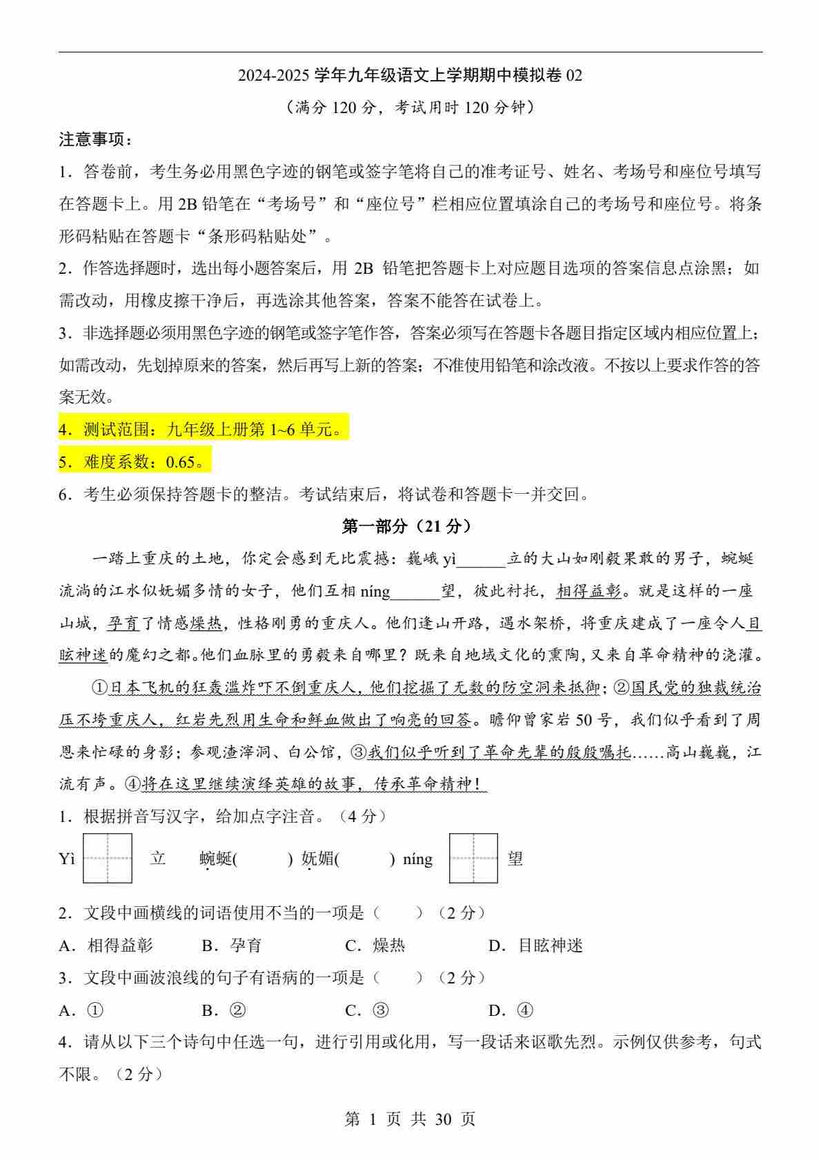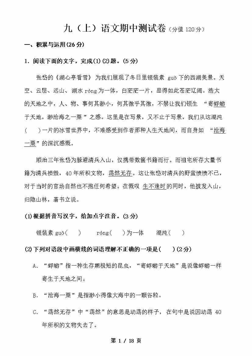 _九上语文期中试卷(详解版)