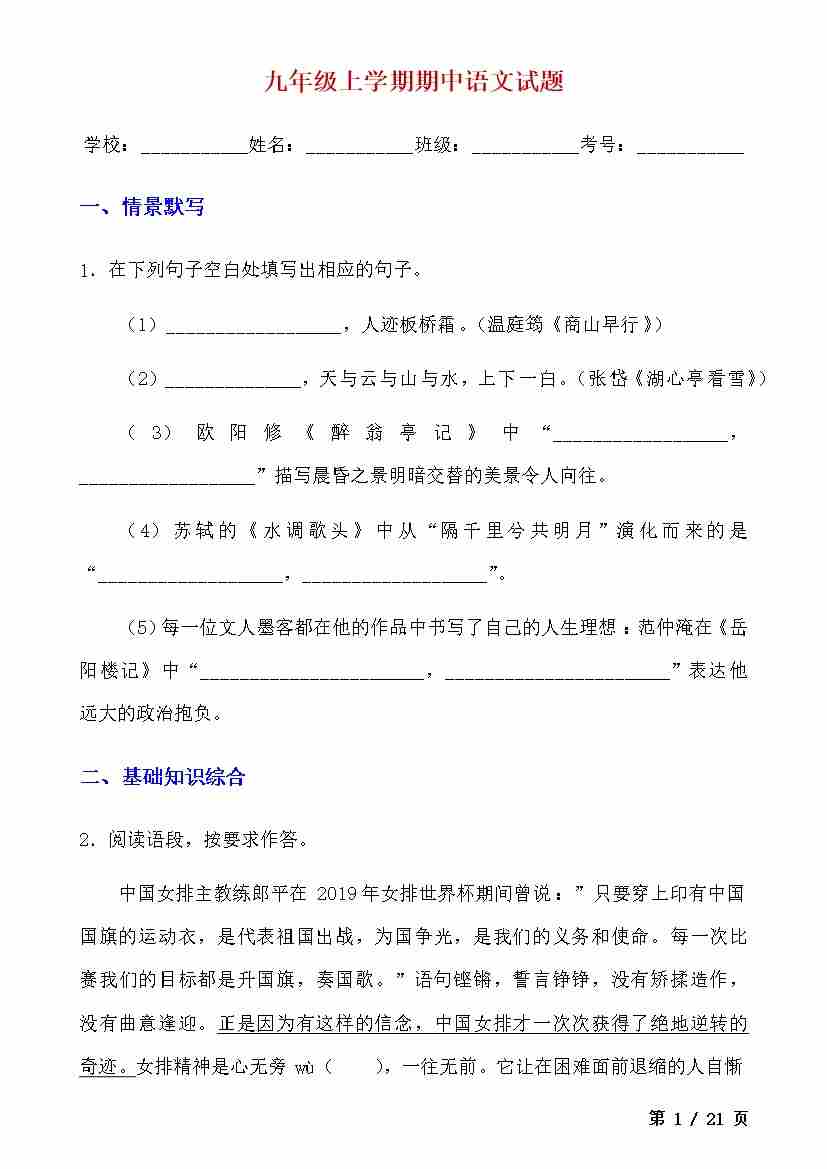 9上语文期中卷02【第1-6单元】