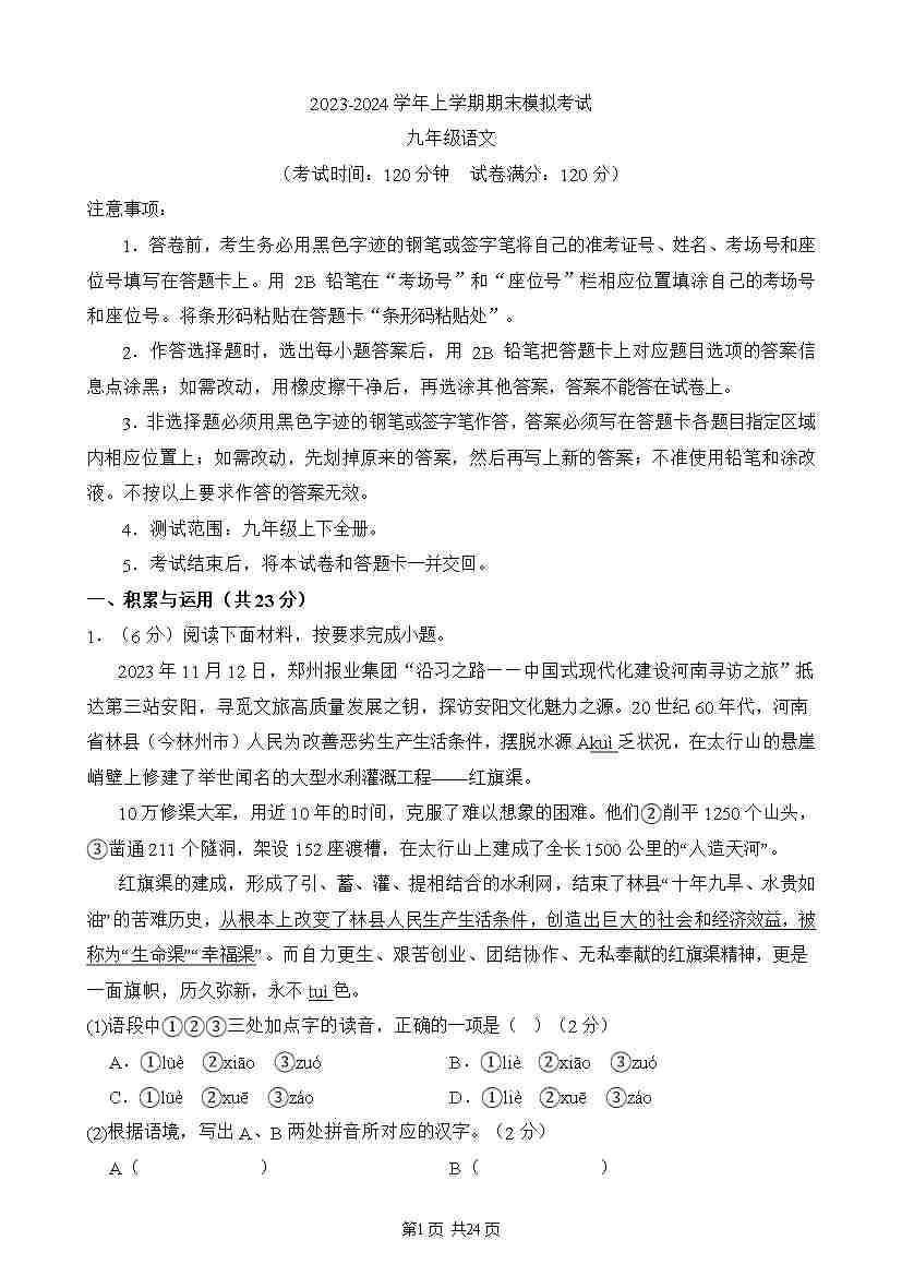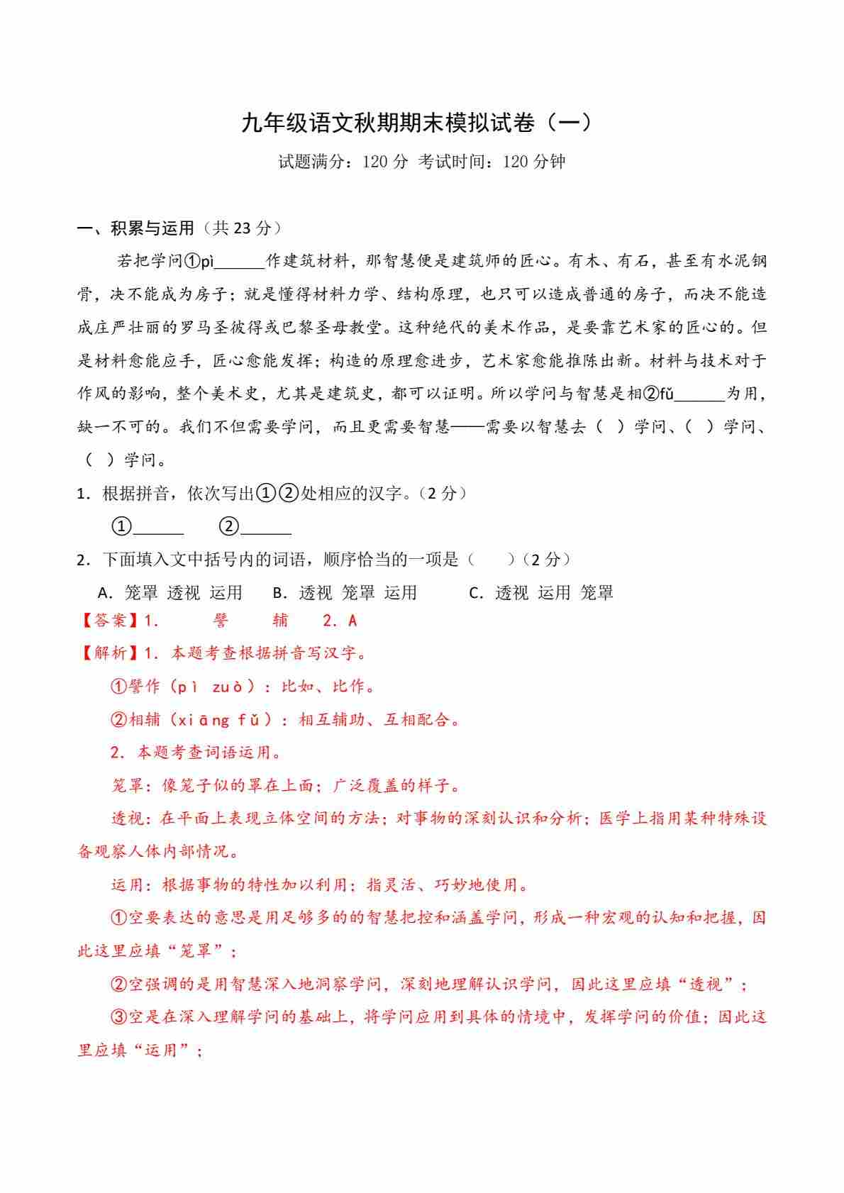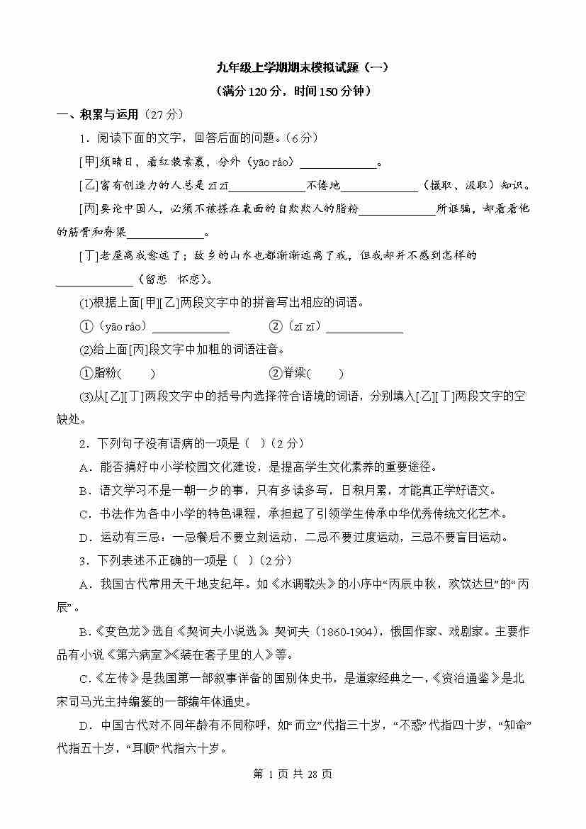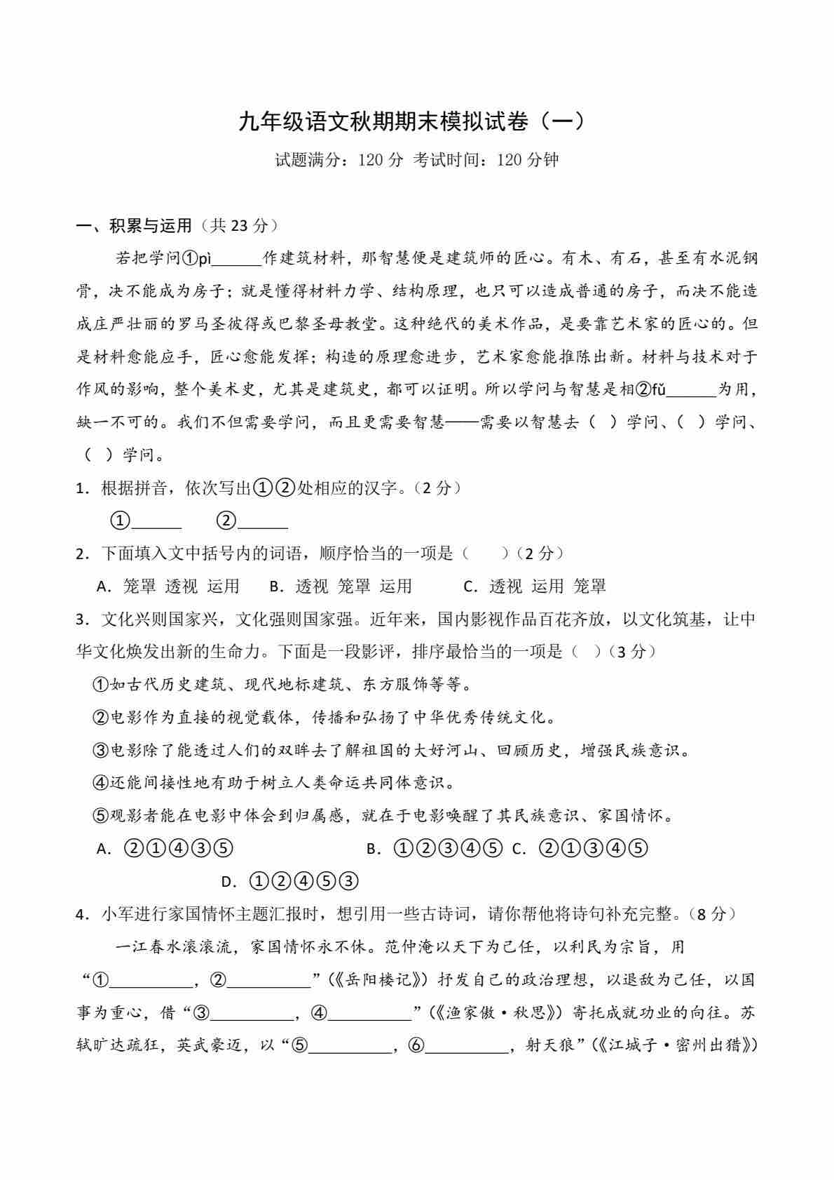九上语文:期末模拟卷01【测试范围:九年级上下全册】