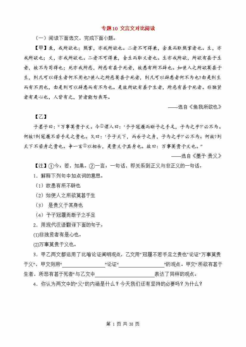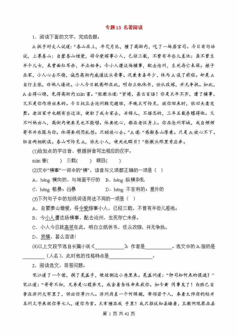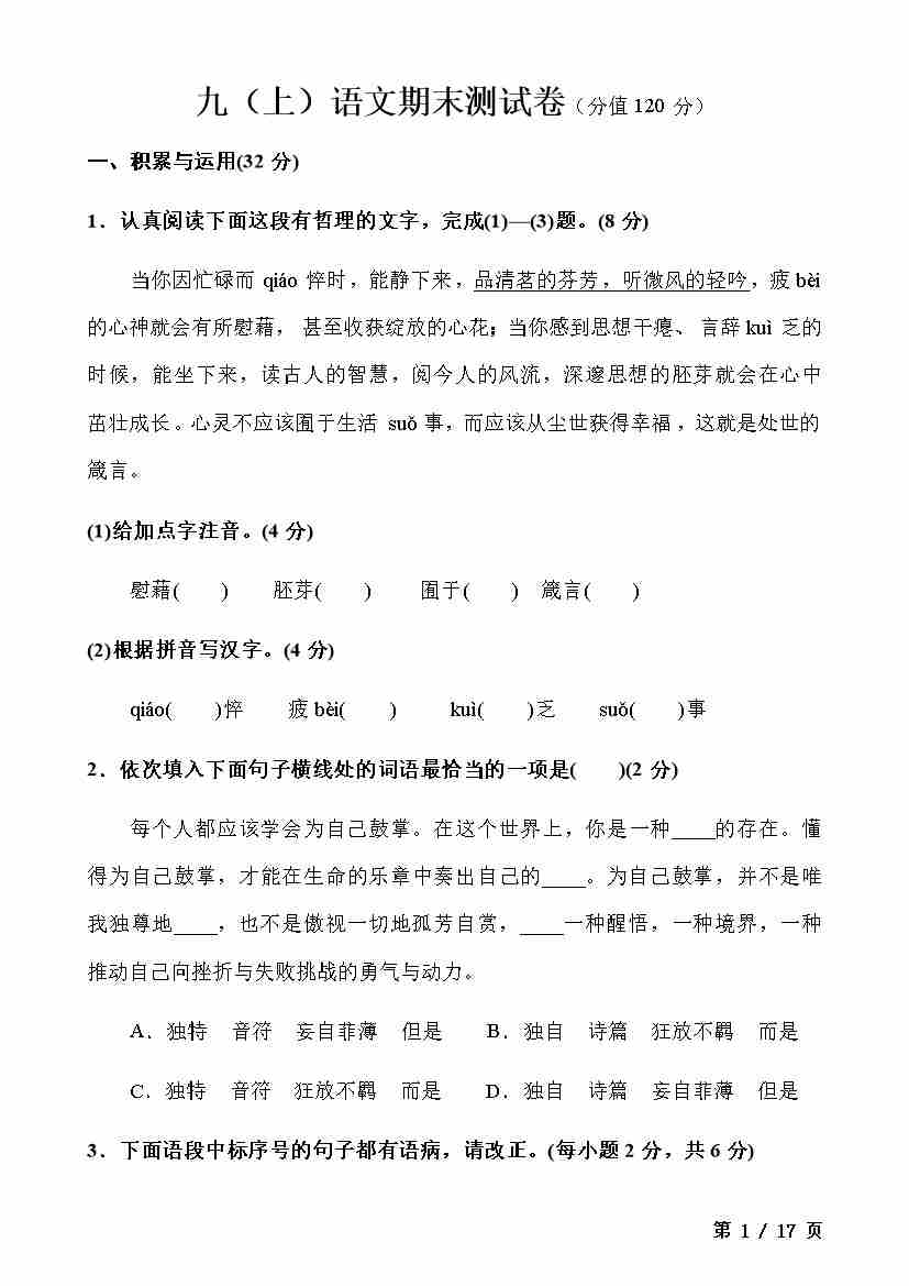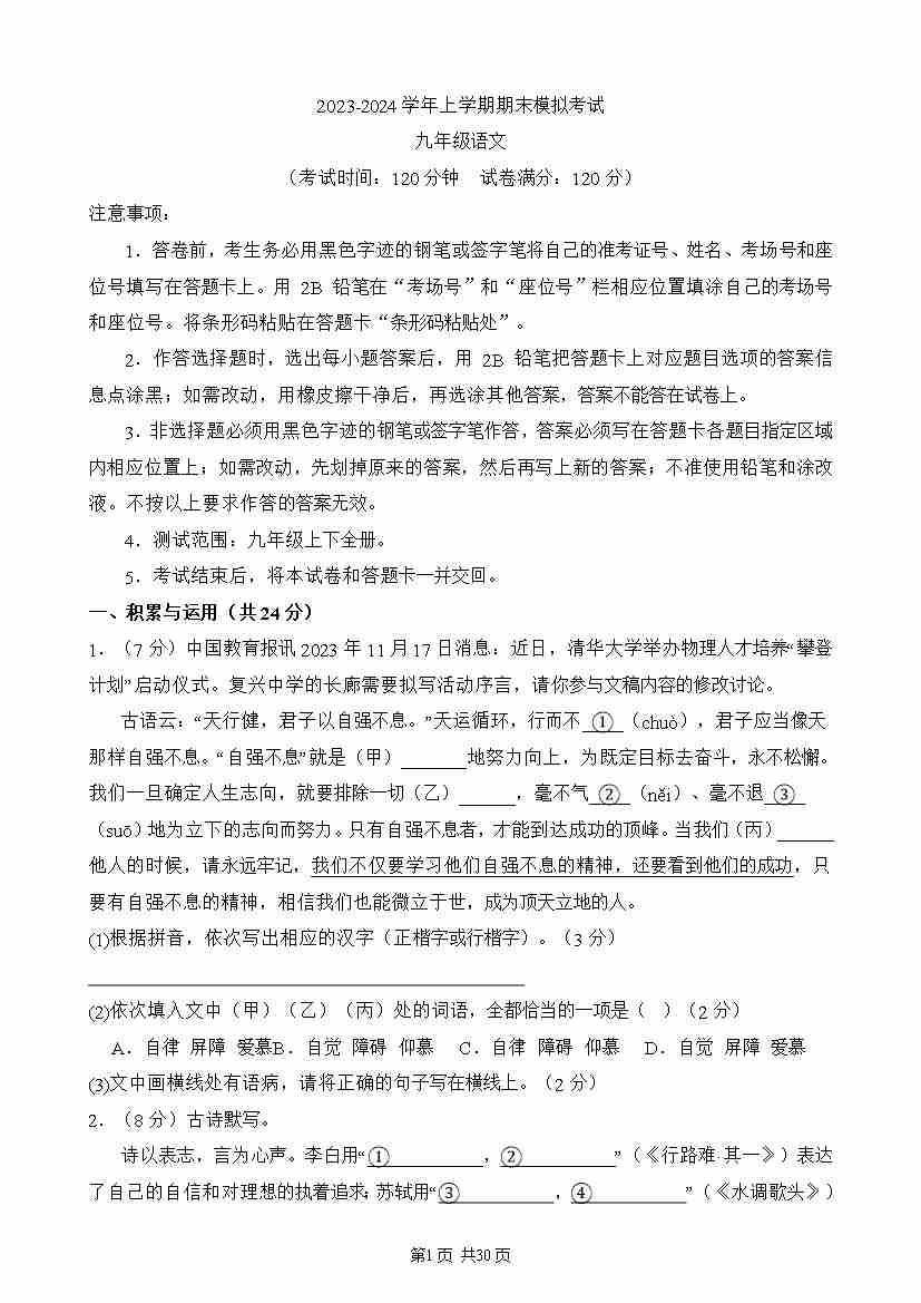 九上语文:期末模拟卷01【测试范围:九年级上下全册】