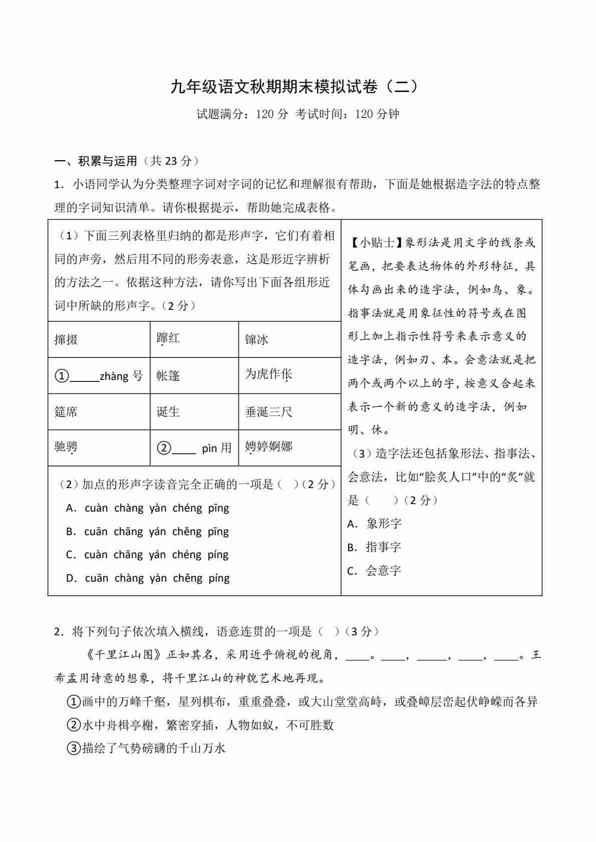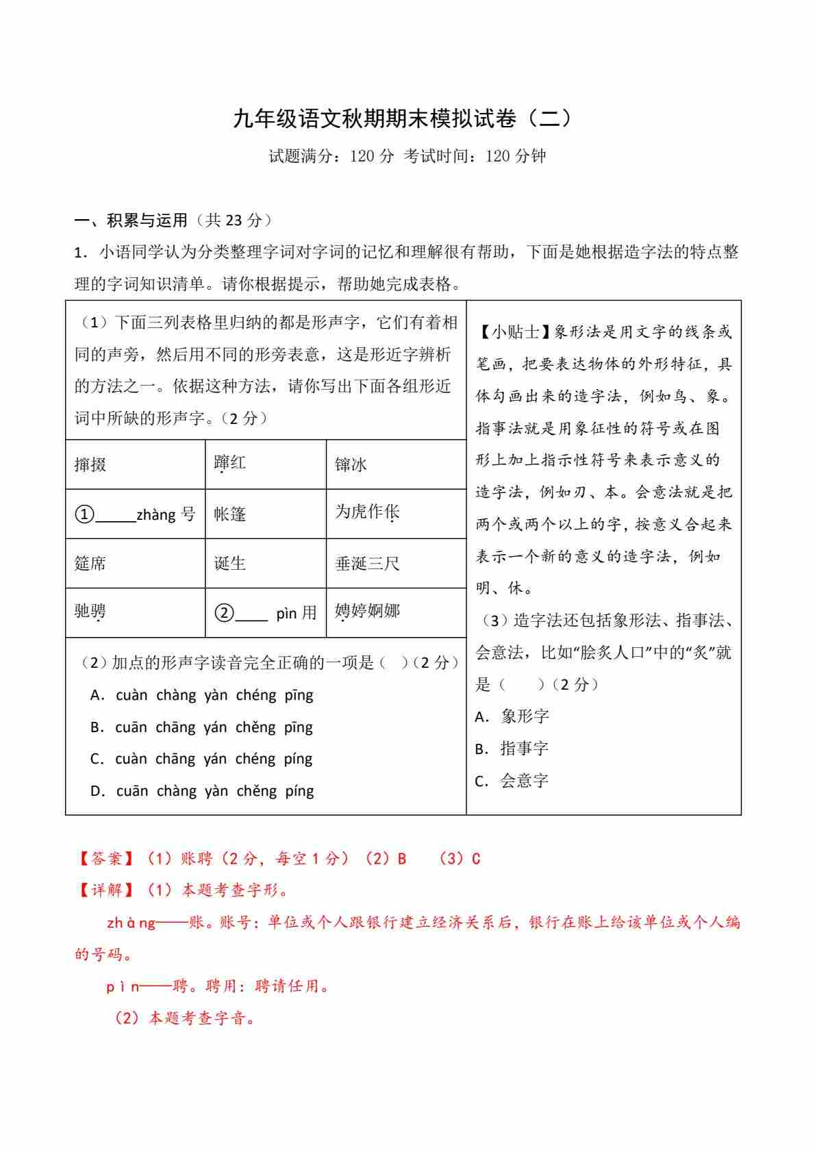 九上语文:期末模拟卷02【测试范围:九年级上下全册】