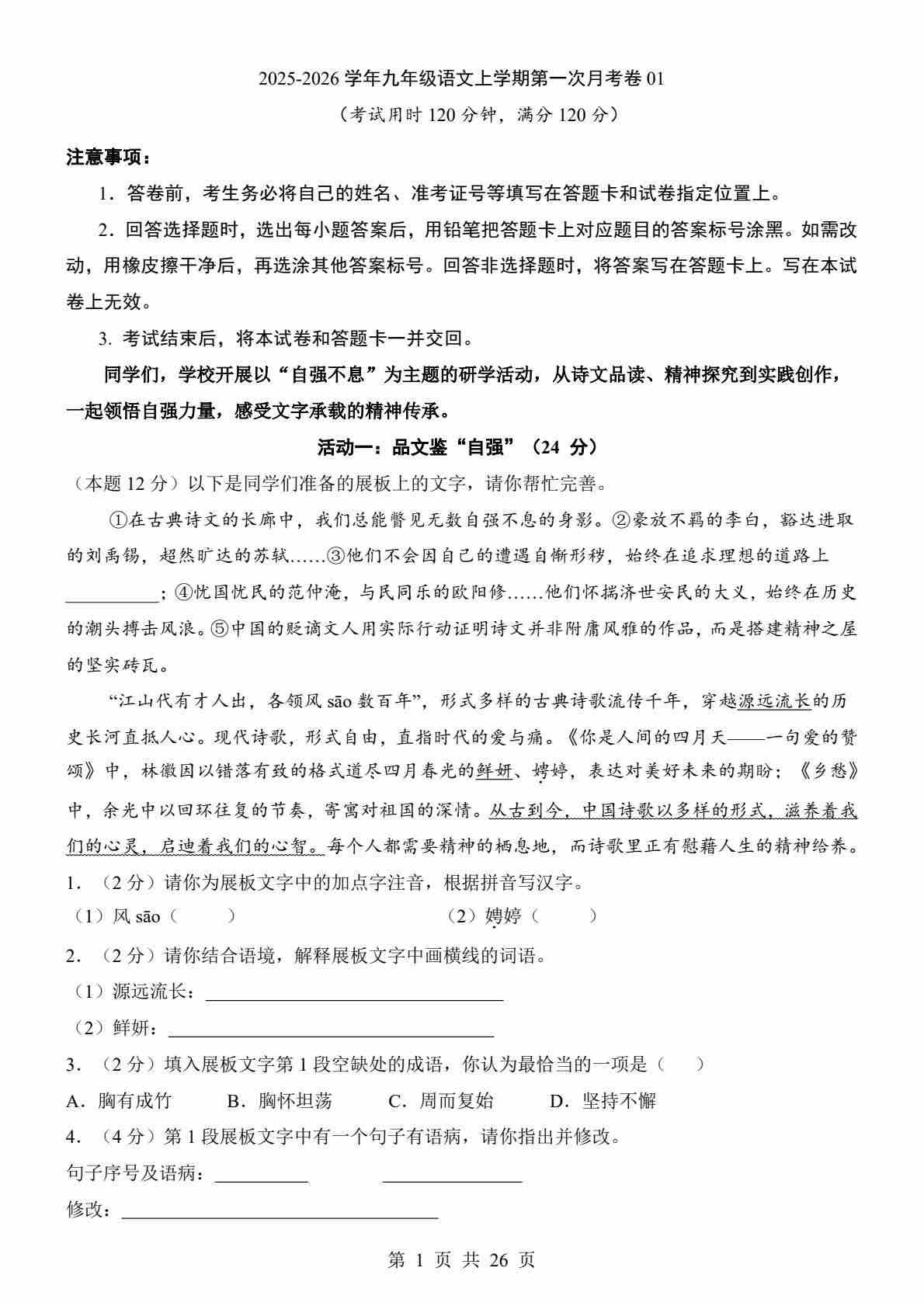 【54制】9上语文第1次月考【第1-2单元】