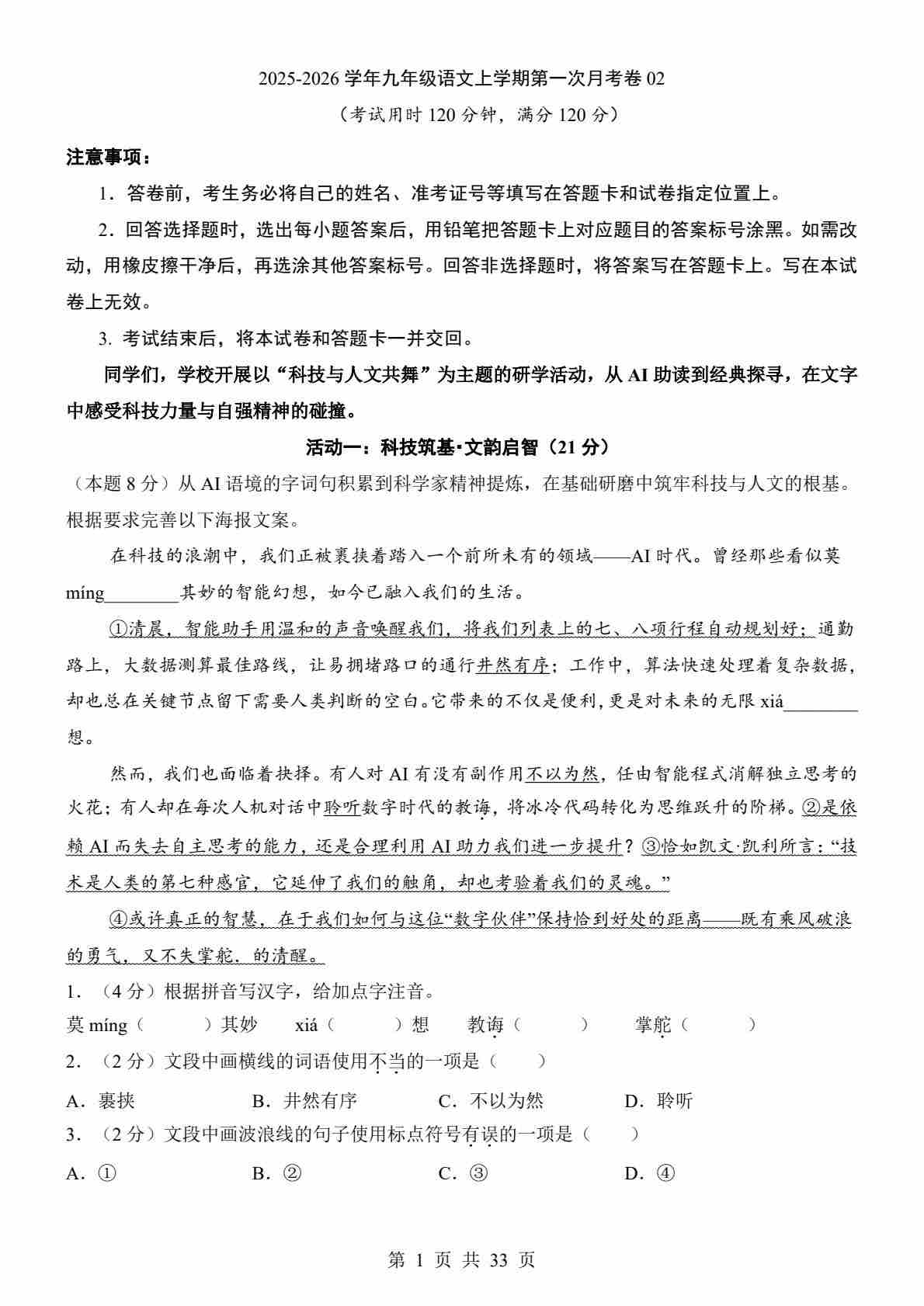 【54制】9上语文第1次月考【第1-3单元】