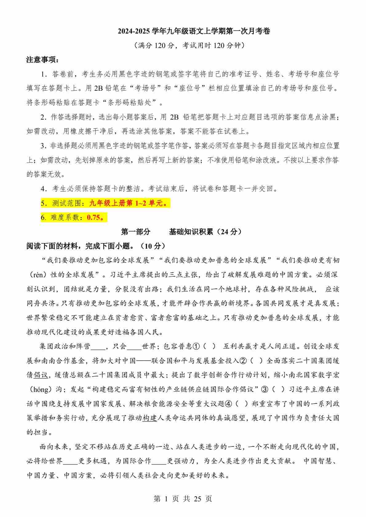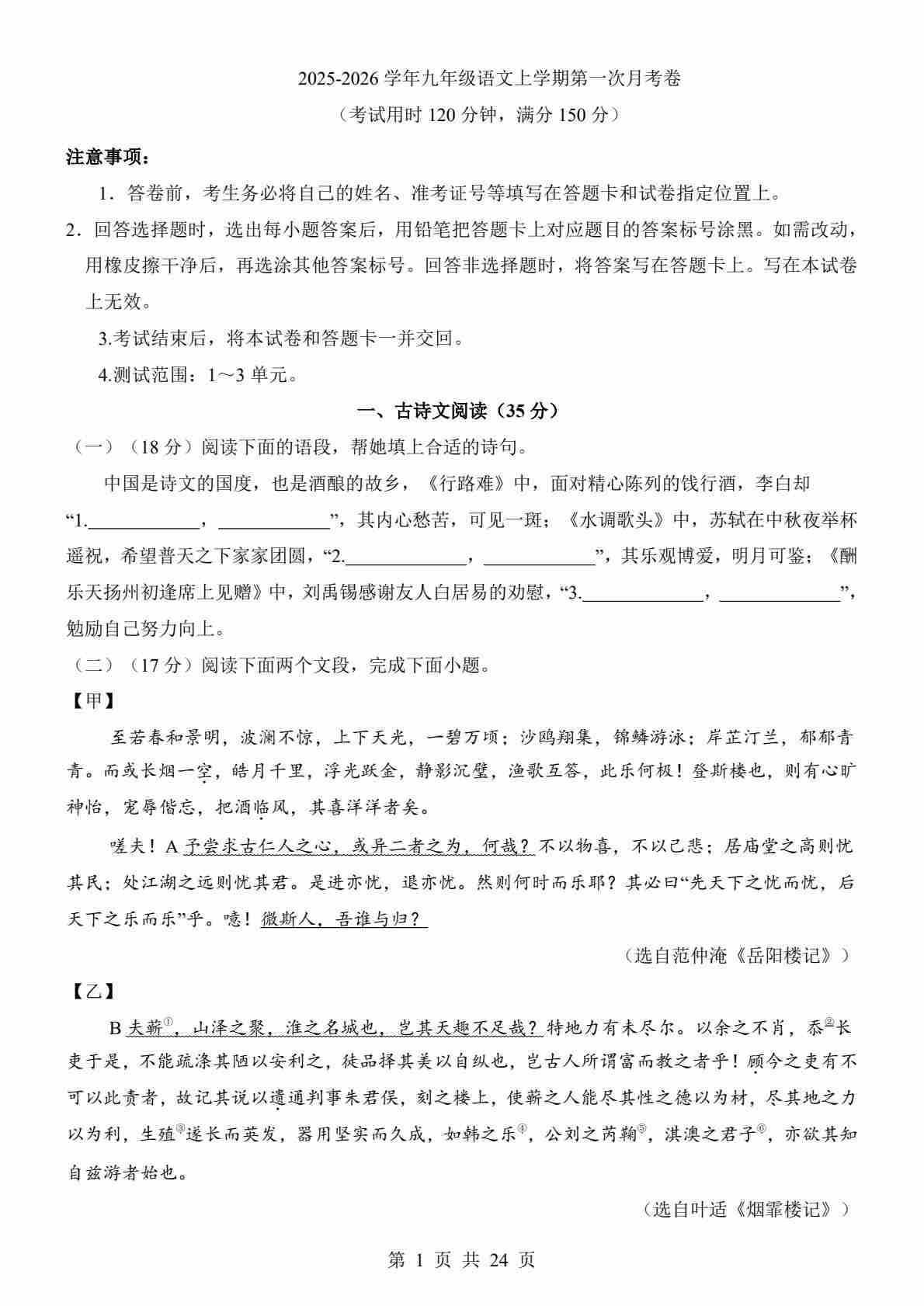 9上语文第1次月考01【第1-3单元】