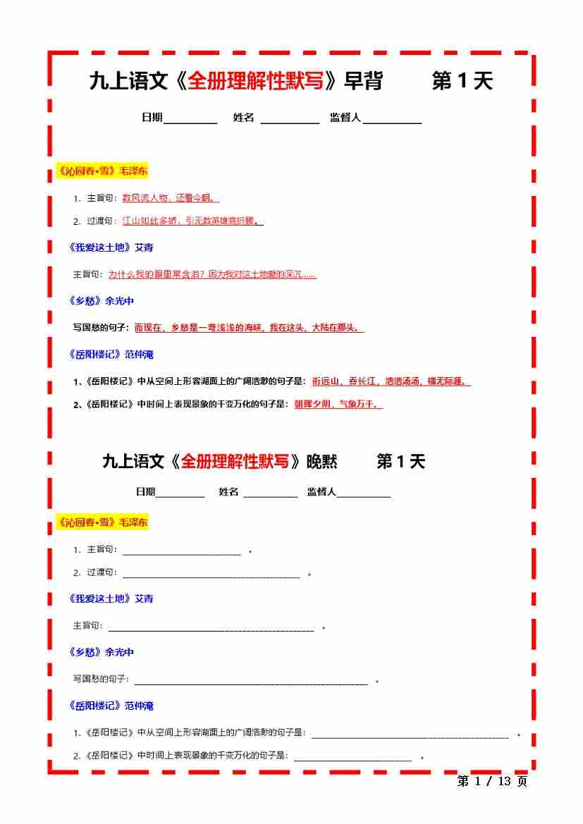 九上语文全册理解性默写重点标记