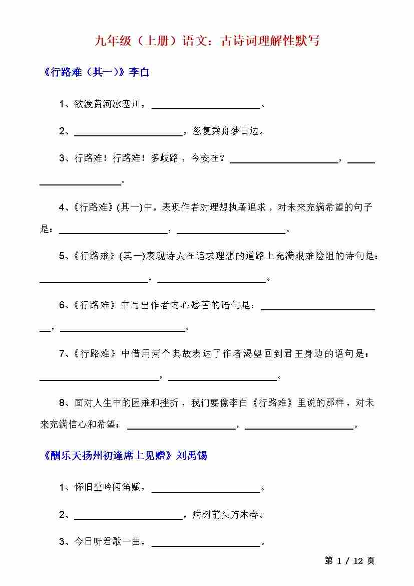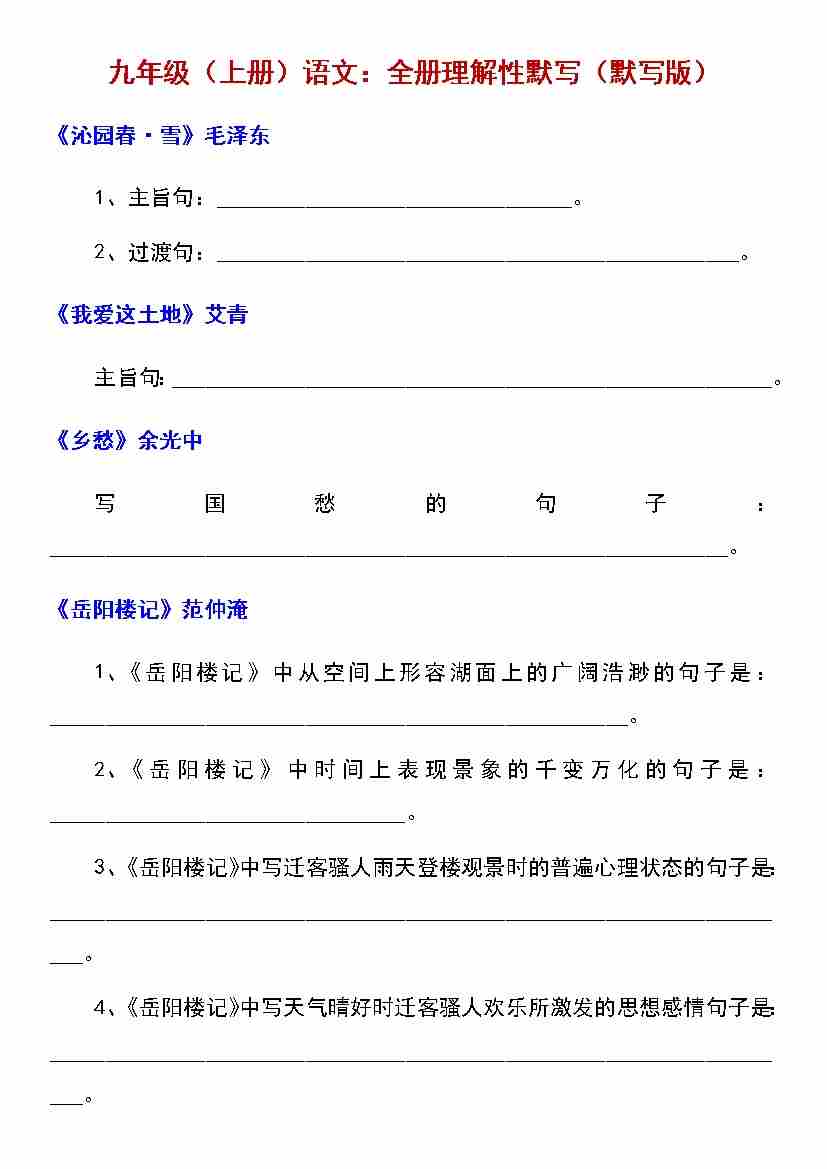 九上语文古诗文理解性默写2--通编版