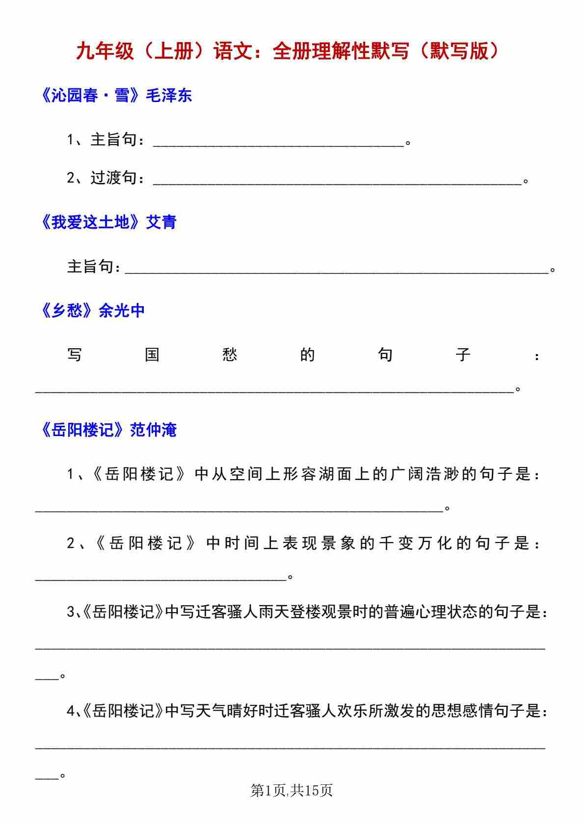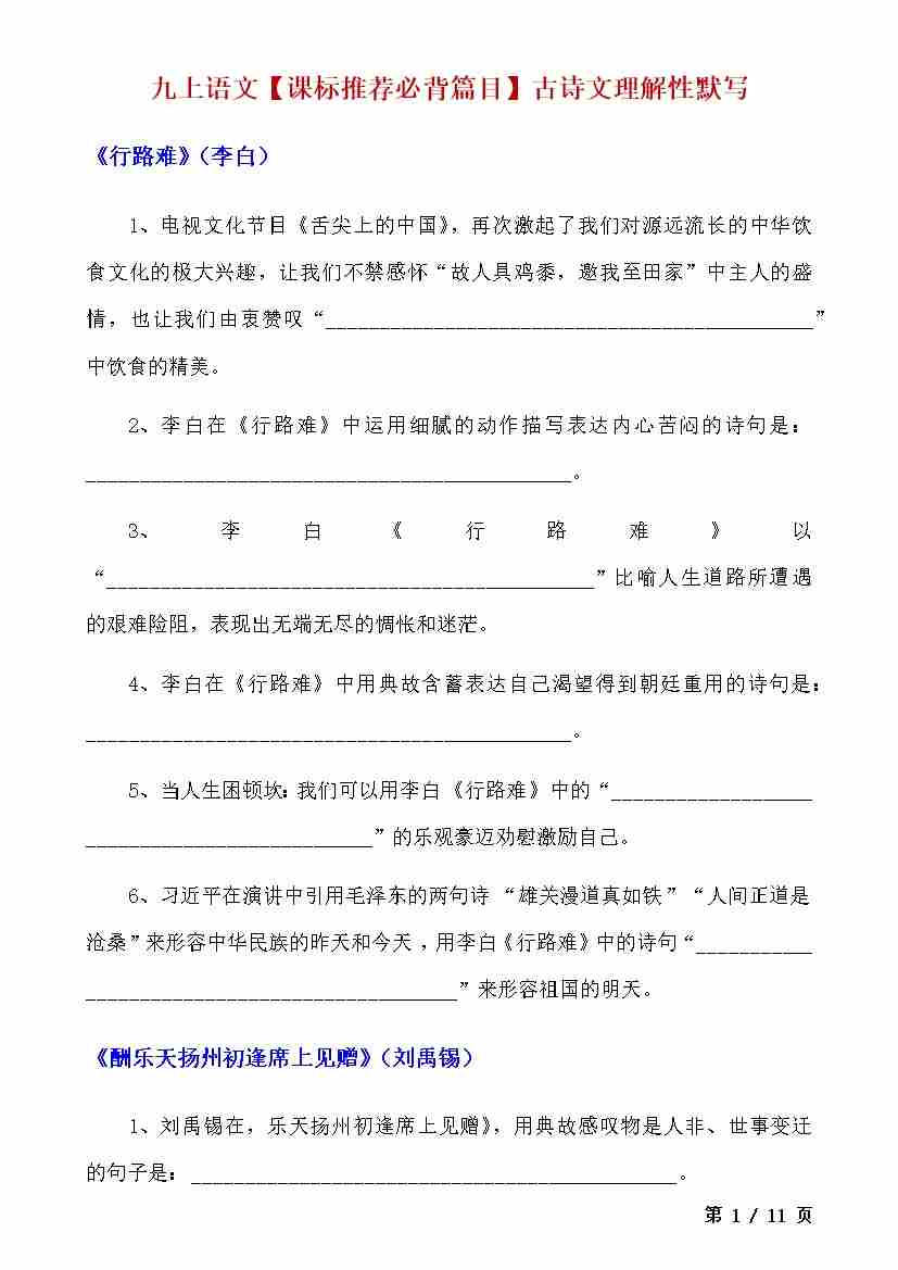 九上语文古诗词理解性默写1