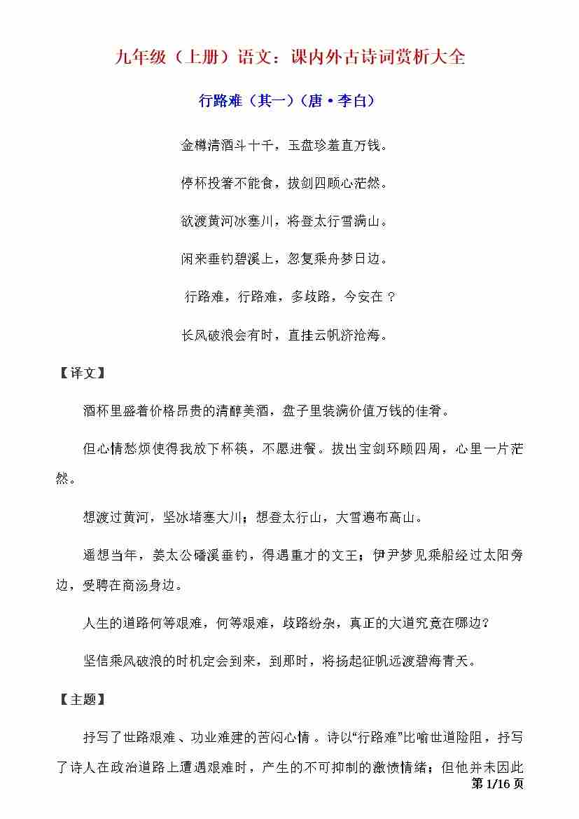 九上语文课内外古诗词赏析大全