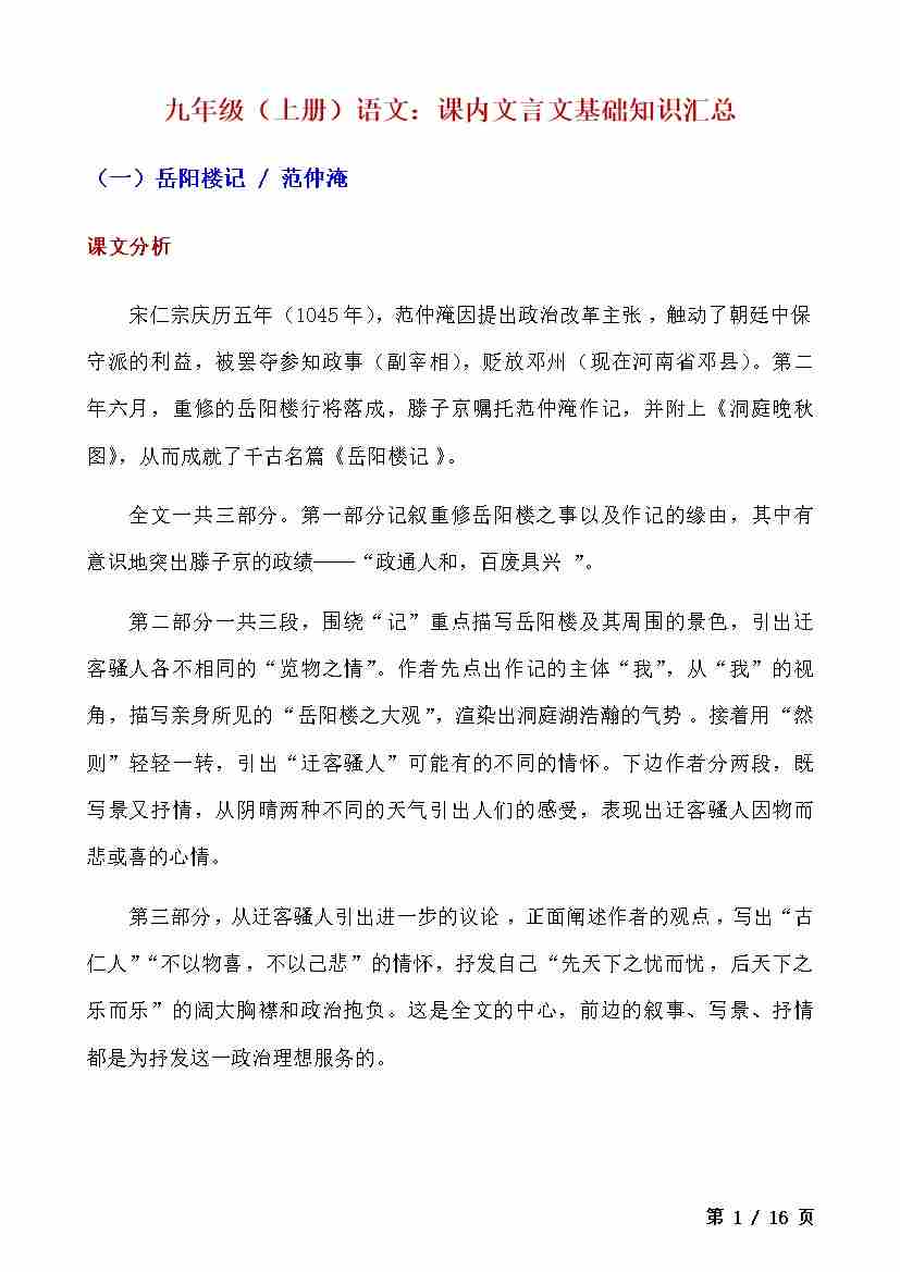 九上语文课内文言文基础知识汇总