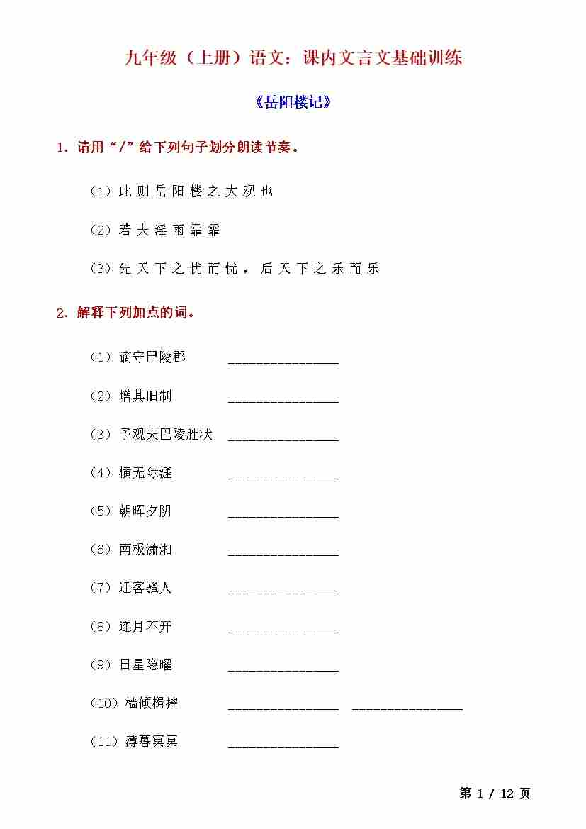 九上语文课内文言文基础训练