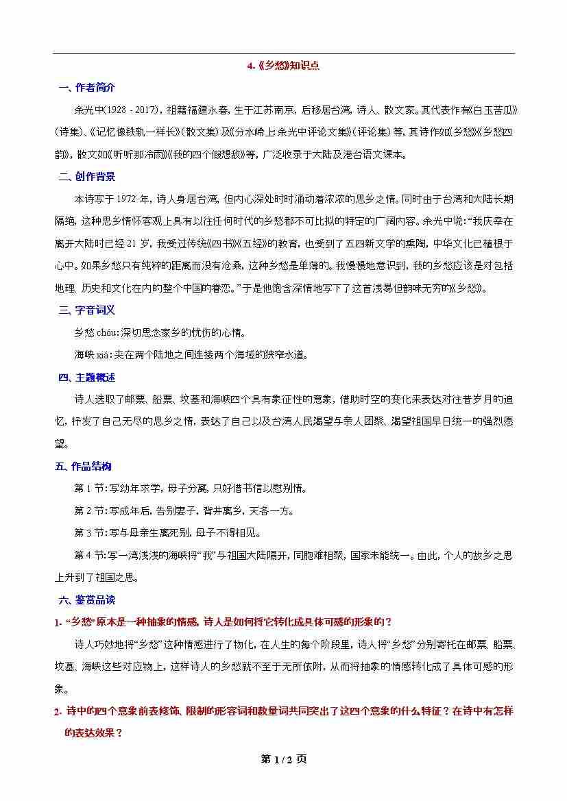 第4课 《乡愁》知识点