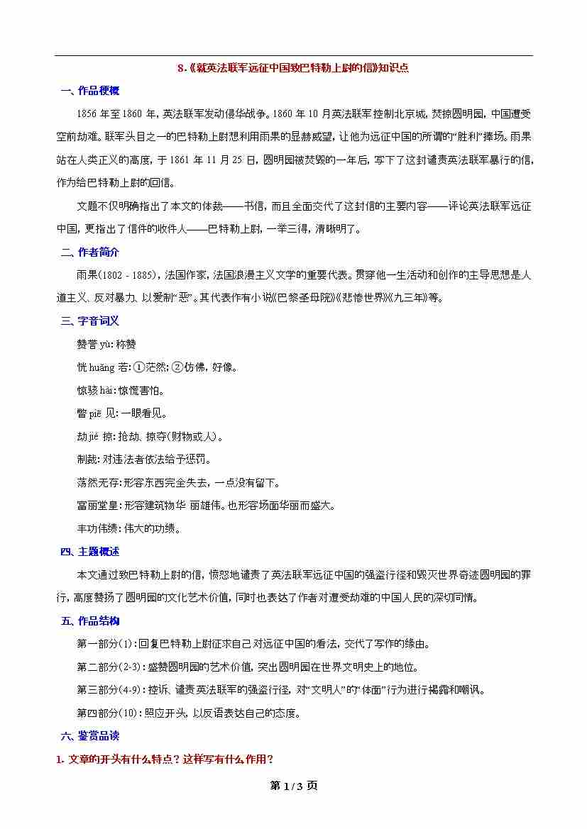 第8课《就英法联军远征中国致巴特勒上尉的信》知识点