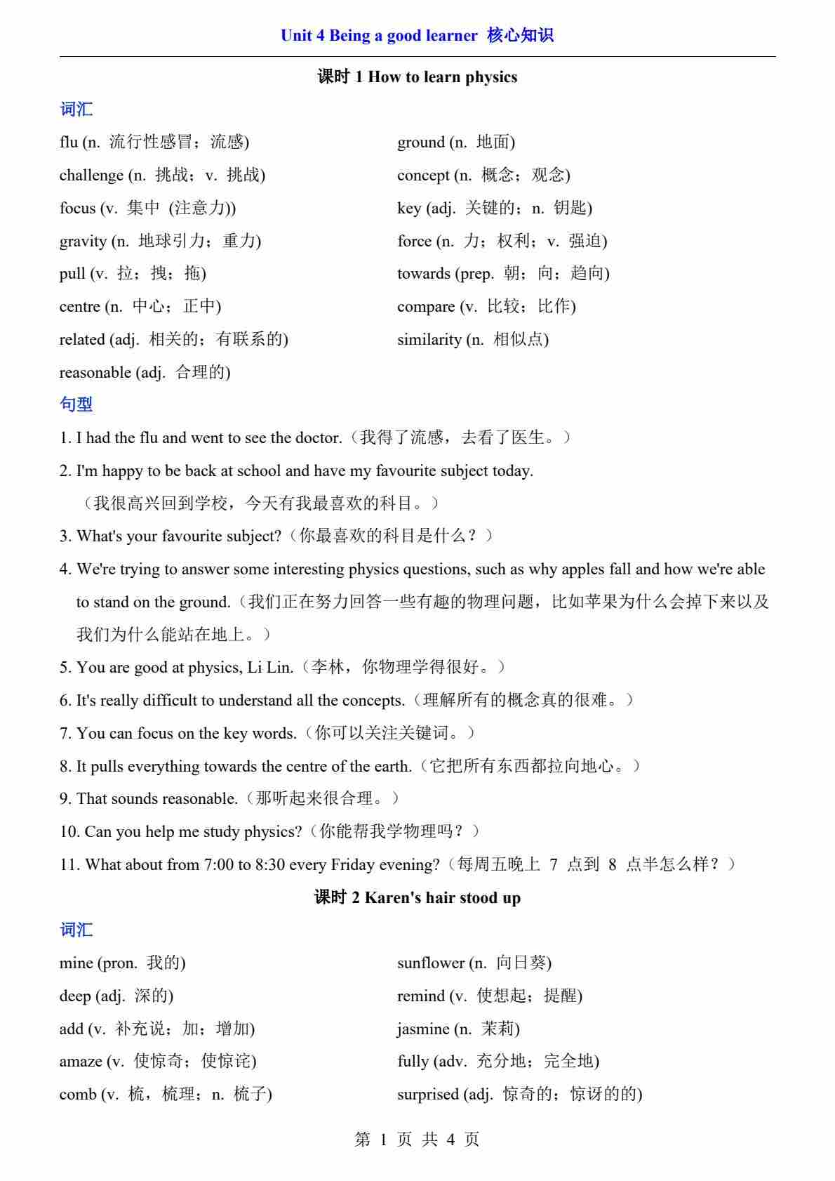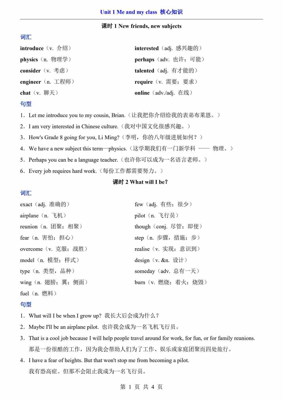 Unit 1(核心知识)八上英语--冀教版-知识梳理