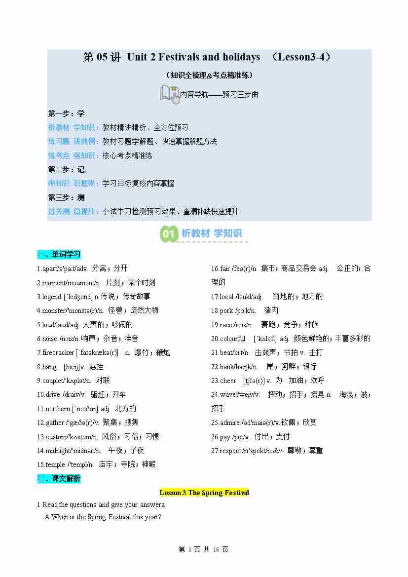 第05讲 Unit 2 Festivals and holidays(Lesson3-4)(知识全梳理--考点精准练)(原卷版)