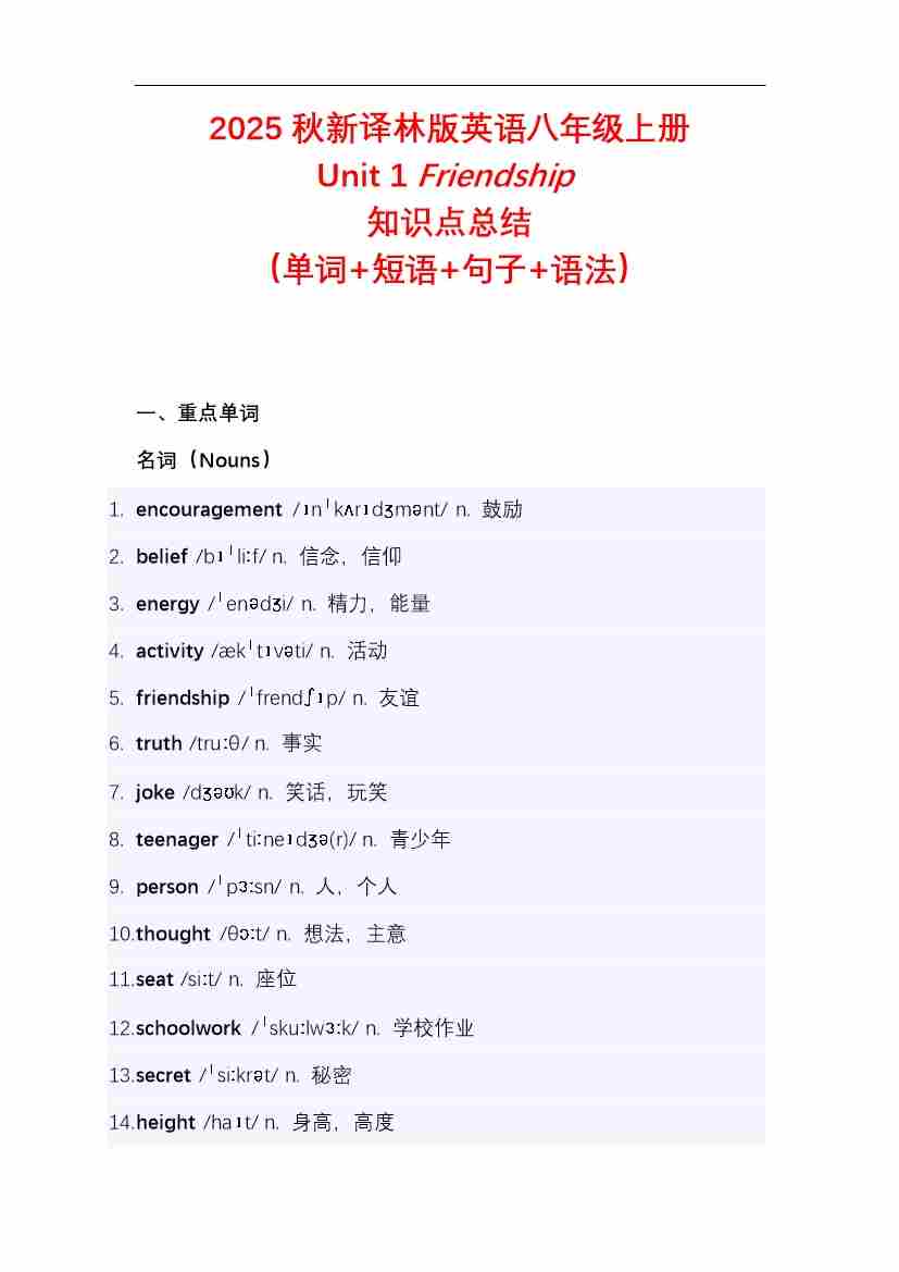 Unit 1 Friendship 知识点总结讲义(单词 短语 句子 语法)2025秋新译林版英语八年级上册