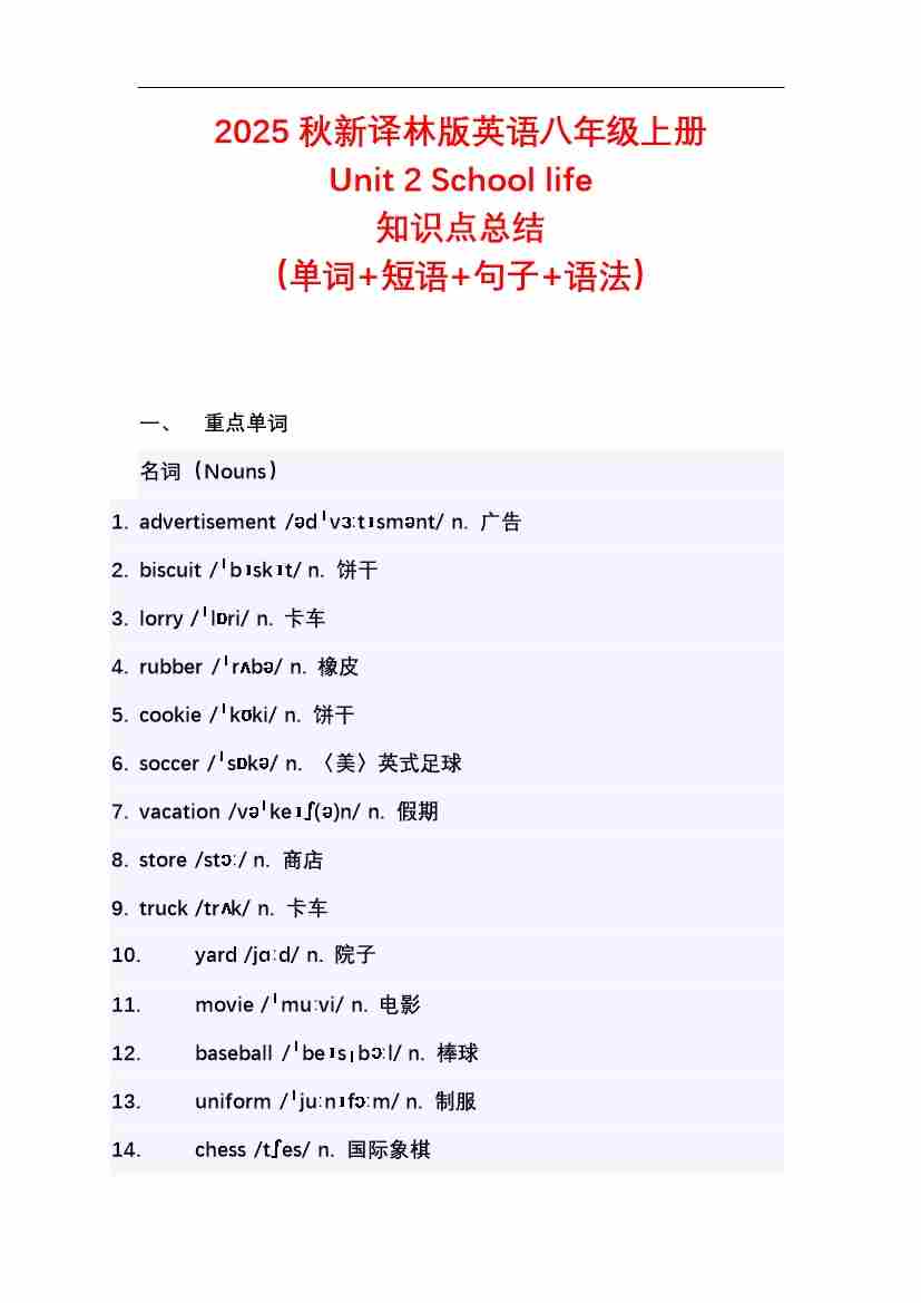 Unit 2 School life知识点总结讲义(单词 短语 句子 语法)2025秋新译林版英语八年级上册